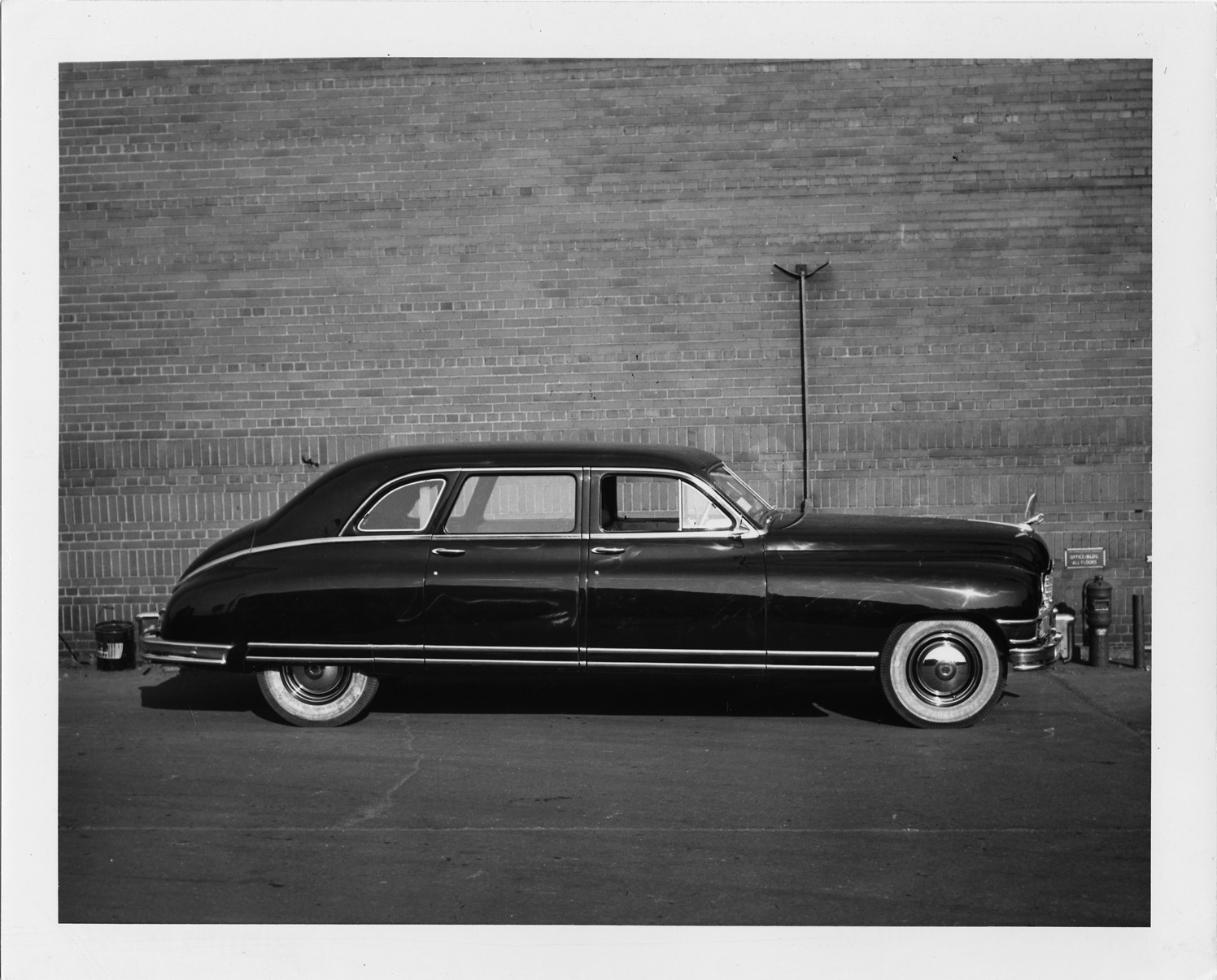 Packard Co. file photograph of a 1948 Packard right side view, pelican emblem, dual white sidewall tires, 4-door, parked alongside brick building. Inscribed on photo back: "1948 Packard 7-person custom sedan."