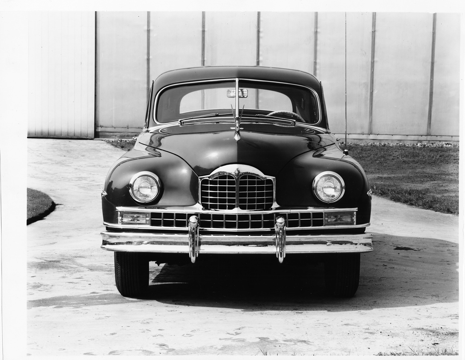 Packard Co. file photograph of a 1949 Packard sedan, front view, pelican emblem, parked on drive, building in background. Inscribed on photo back: "1949 Packard, 2300 series."