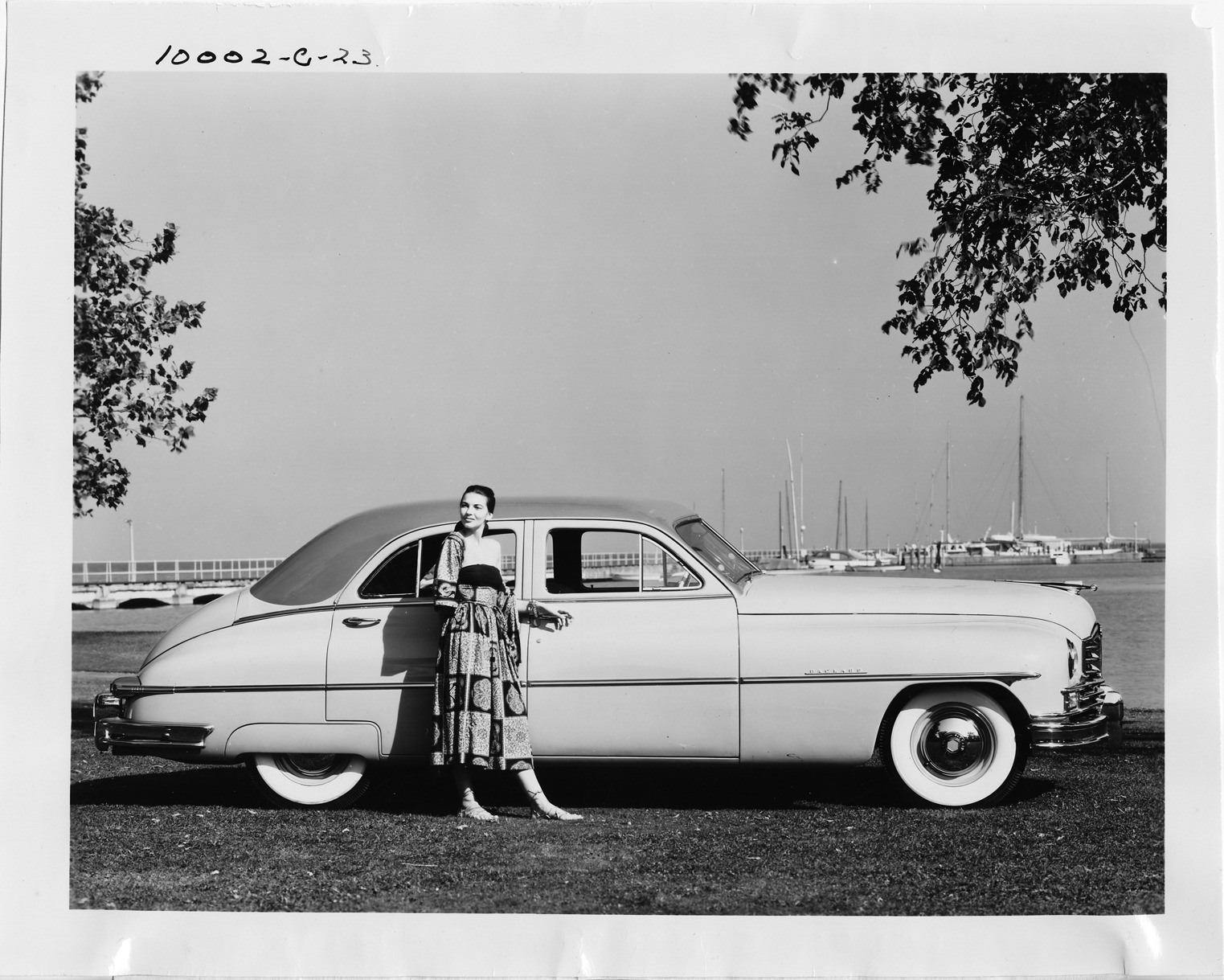 Packard Co. file photograph of a 1949 Packard right side view, parked on grass, woman standing at front passenger door, pier with boats in background. Photo caption on back from Packard News Service: "Increased power and longer wheelbase are among features of the new Golden Anniversary Packard super touring sedan, the famed "Packard Arrow," one of the design notes which have long distinguished Packard styling, sweeps along the "free flow" body and blends into new, enlarged chrome tail lights, the super engine has been stepped up to 150-horsepower from 145, while the wheelbase has bee increased to 127-inches from 120-inches for greater riding comfort."