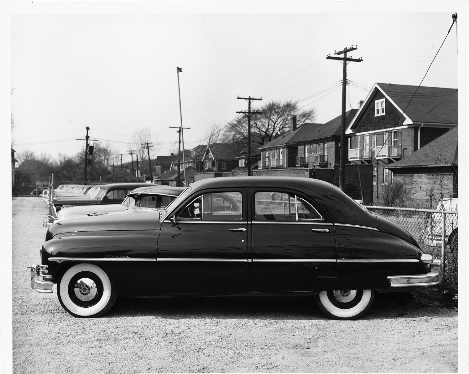 1949 Packard sedan, left side view, parked in lot, houses in background