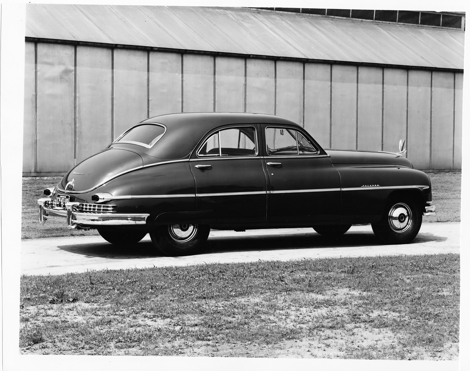 Packard Co. file photograph of a 1949 Packard sedan, seven-eights rear left view, pelican emblem, parked outside. Inscribed on photo back: "1949 Packard 2300 series."