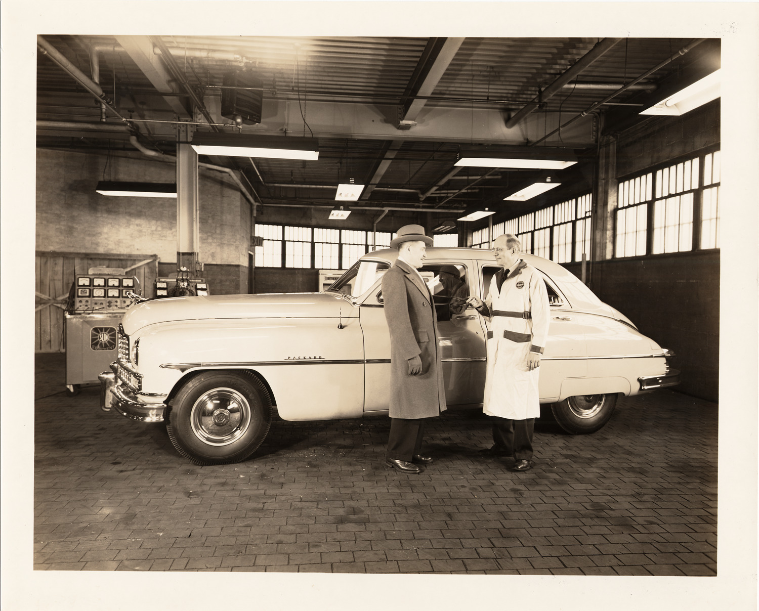 Packard Co. file photograph of a 1950 Packard left side view, pelican emblem, 4-door, Mike Kollins & T.W. Nerthey standing at driver's door, photographed in some type of garage. Inscribed on photo back: "1950 Packard model 2306 sedan, Mike Kollins & T.W. Nerthey."