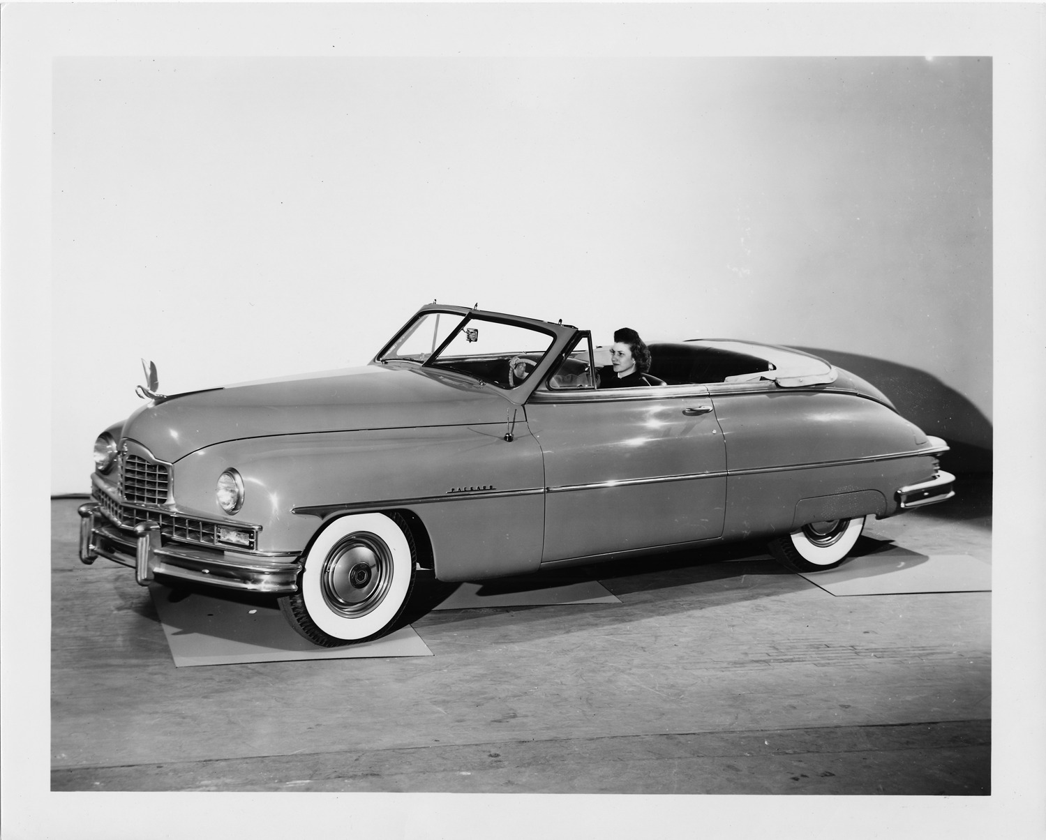 Packard Co. file photograph of a 1950 Packard seven-eights left side view, top folded, dual white sidewall tires, pelican emblem, 2-door, woman behind wheel. Inscribed on photo back: "1950 Packard, June Nickel in custom convertible."
