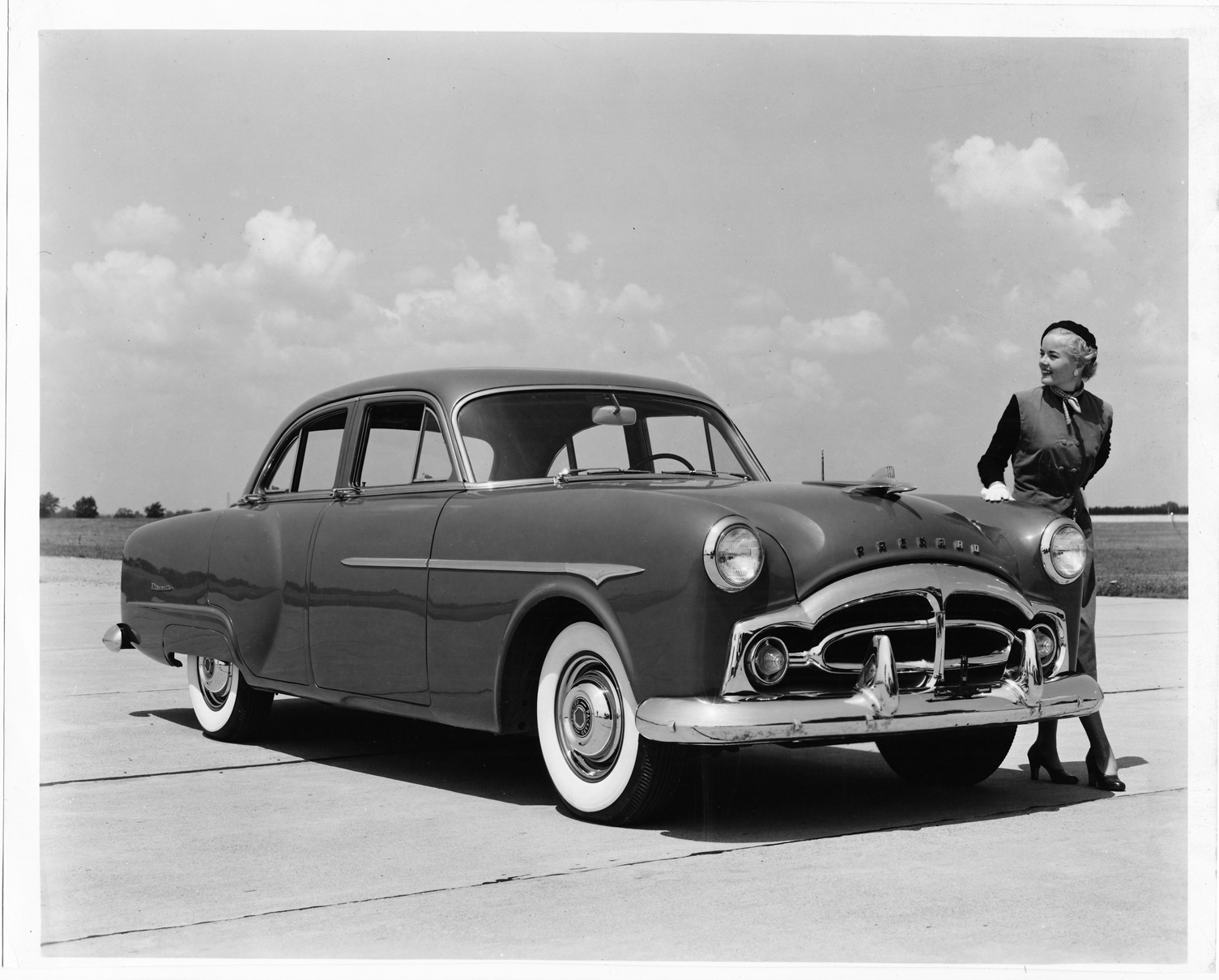 Woman posing with 1951 Packard 200 touring sedan