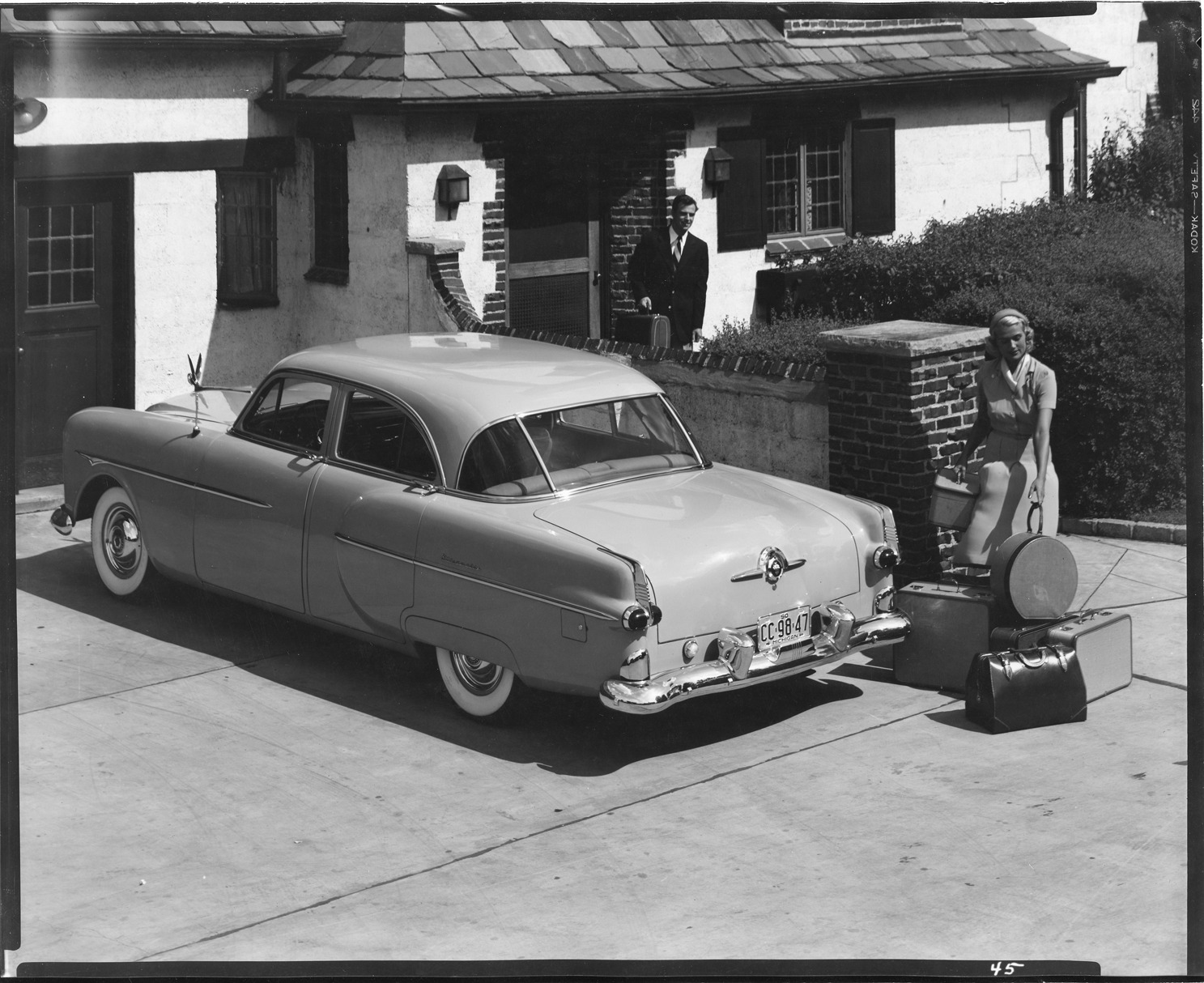 1951 Packard sedan parked in driveway in front of house and woman with luggage