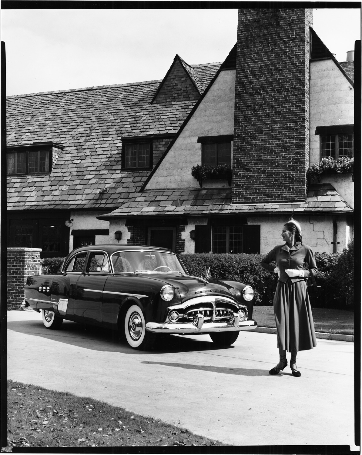 Packard Co. file photograph of a 1951 Packard three-quarter front view, 4-door, dual white sidewall tires, pelican emblem, parked in driveway of house, woman standing near front of car. Inscribed on photo back: "1951 Packard Patrician 400."