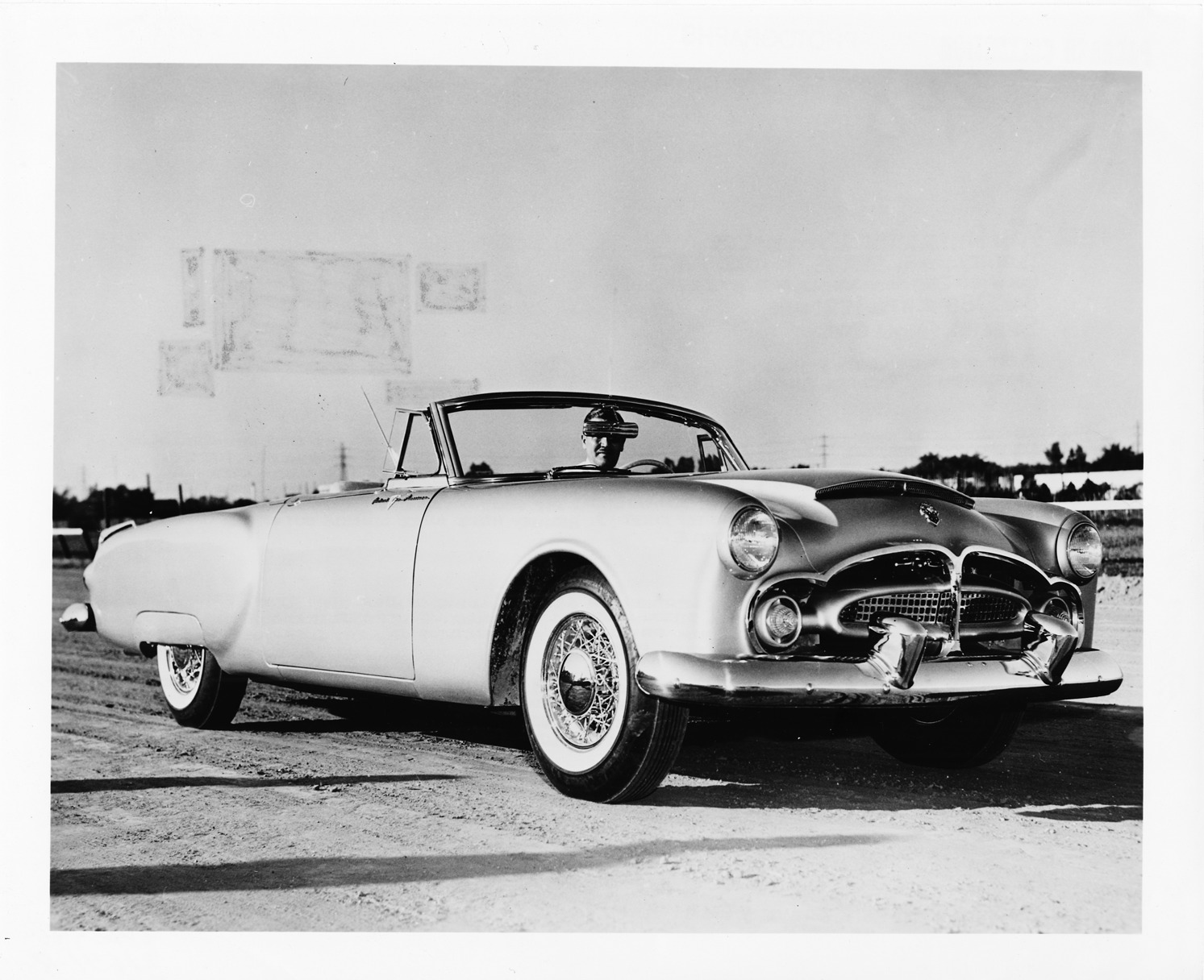 1952 Packard Pan American sports car, seven-eights right side view, man behind wheel