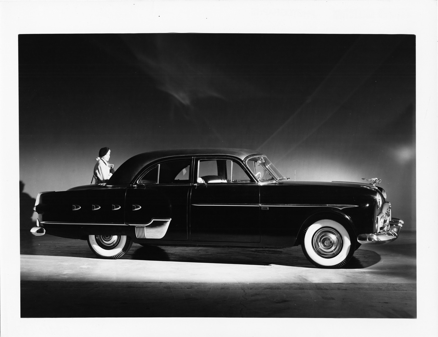 Packard Co. file photograph of a 1952 Packard nine-tenths right side view, 4-door, dual white sidewall tires, pelican emblem, woman standing at rear driver's side. Inscribed on photo back: "1952 Packard Patrician 400, special cars for Chicago show by Cle Clark."