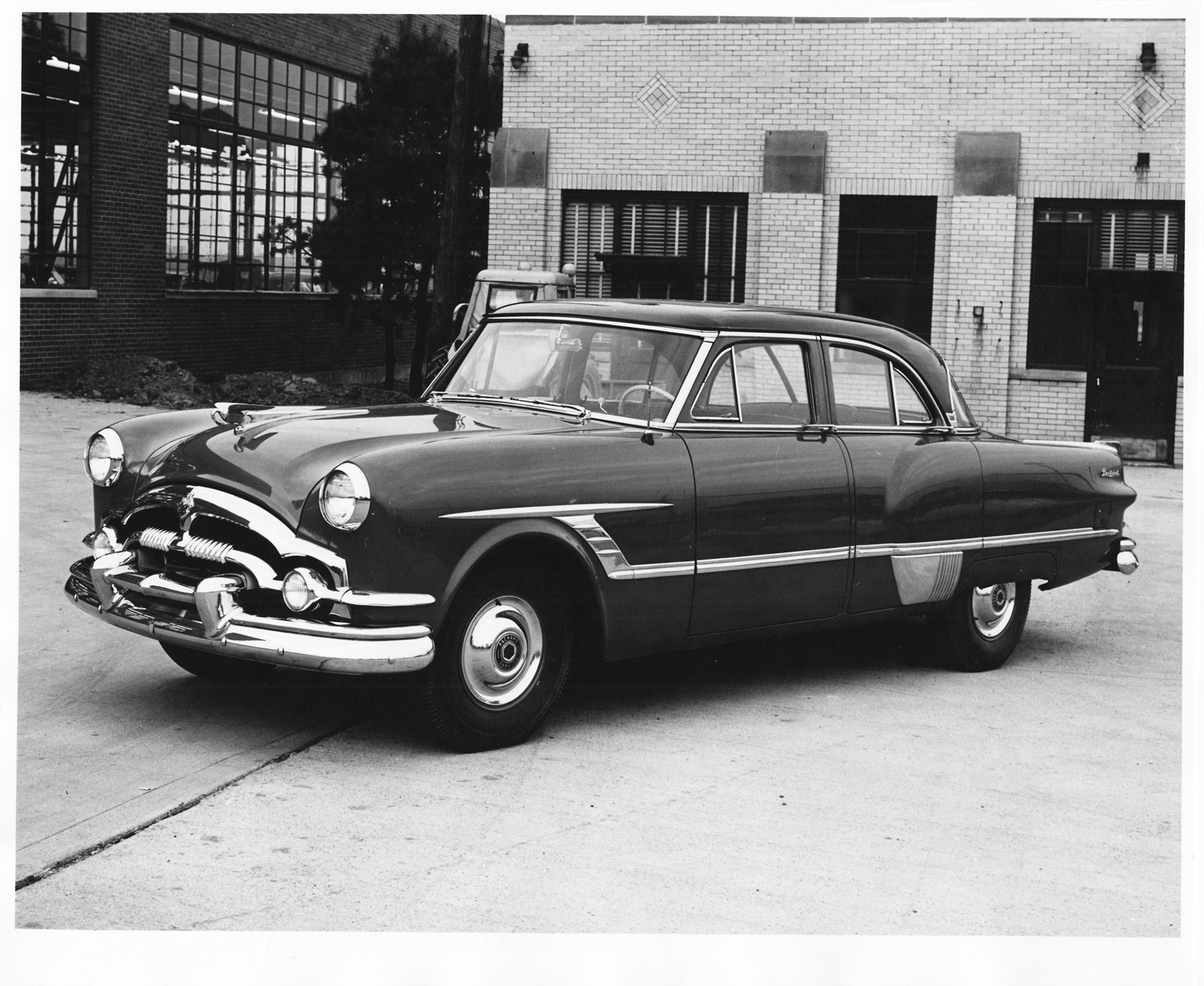 Packard Co. file photograph of a 1953 Packard 4-door sedan, seven-eights left side view, pelican emblem, parked in drive near brick building.