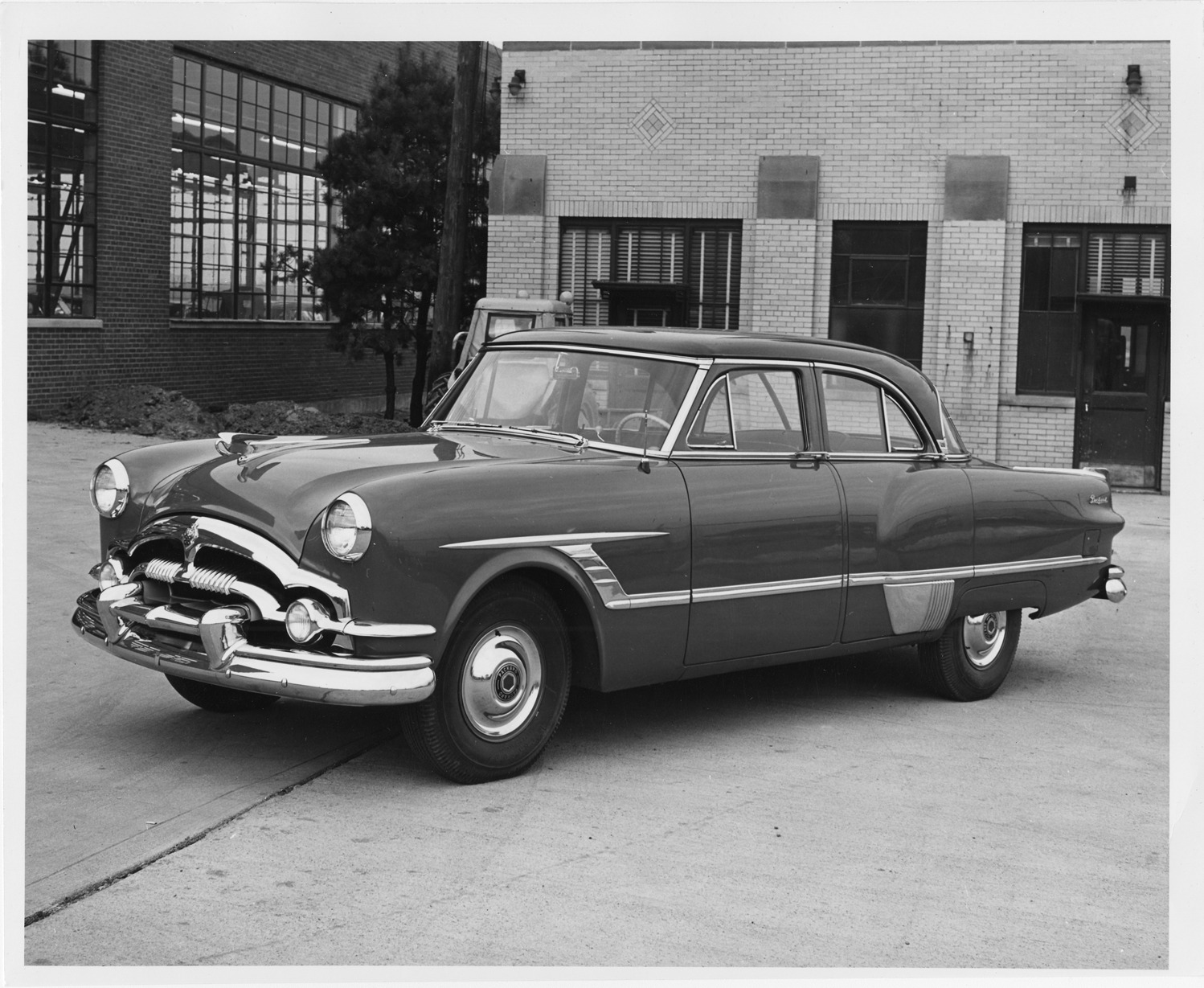 Favorite this☆ 1953 Packard 4-door sedan, three-quarter left side view, parked in drive near brick building Description: Packard Co. file photograph of a 1953 Packard 4-door sedan, three-quarter left side view, pelican emblem, parked in drive near brick building. Details Resource ID: EB01e494 Creator: Packard Motor Car Company Subject: Packard automobile Photographic prints Date Issued: 1953 Format: 1 photographic print ; 8 x 10 in. Member of: National Automotive History Collection Packard Collection Rights: Physical rights are retained by DPL. Copyright is retained in accordance with U.S. copyright laws.