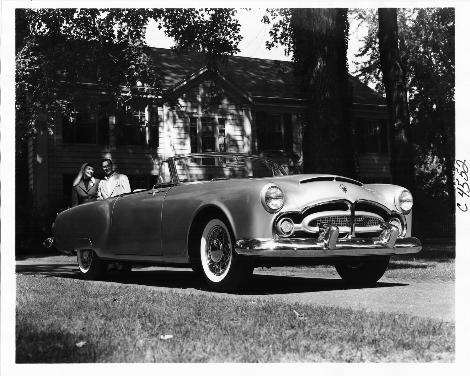 Packard Co. file photograph of a 1953 Packard Pan American convertible, three-quarter front right view, dual white sidewall tires, wire wheels, parked in driveway, couple in background.