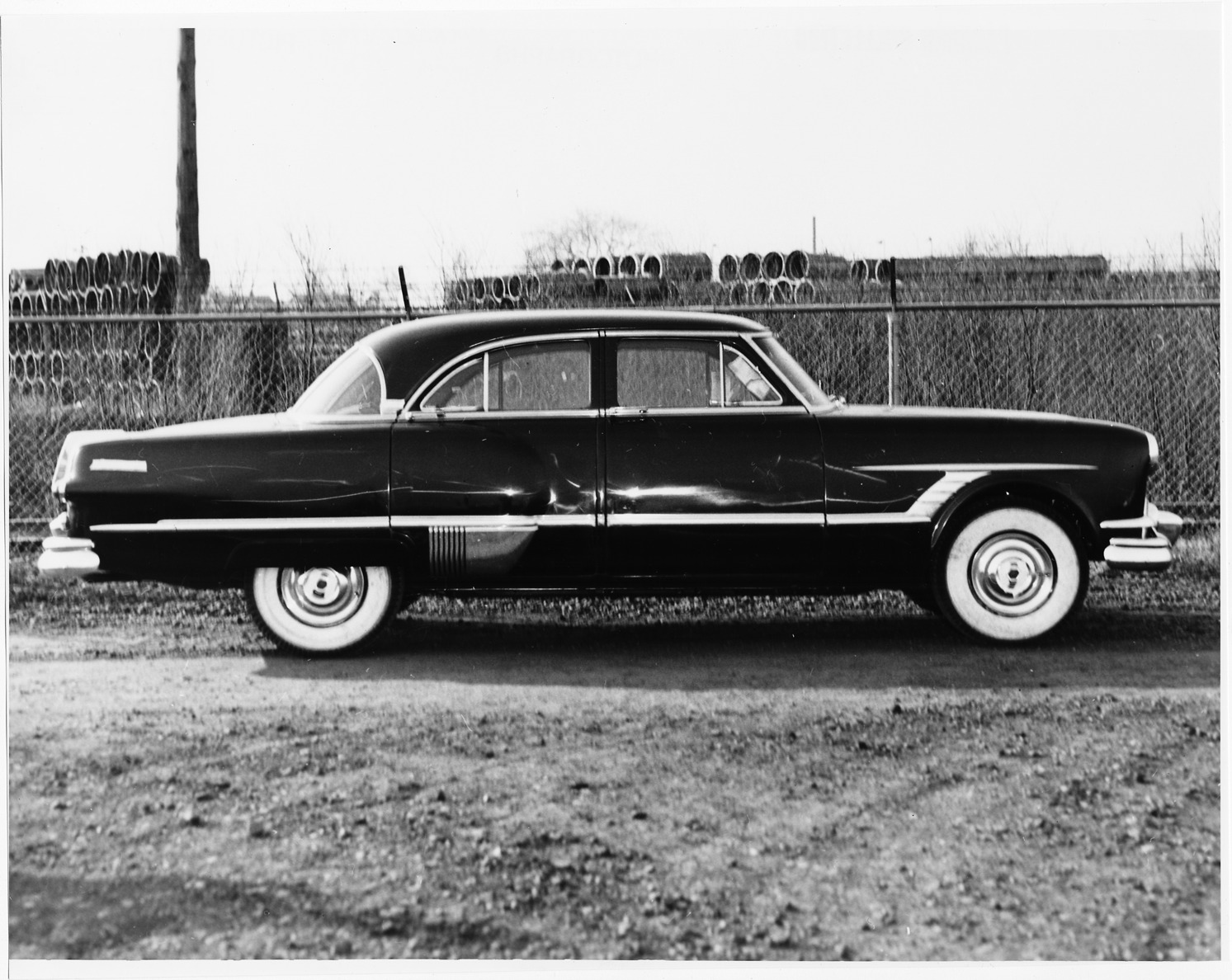 Favorite this☆ 1953 Packard sedan, right side view Description: Packard Co. file photograph of a 1953 Packard right side view, 4-door, dual white sidewall tires, parked on gravel near chain link fence. Details Resource ID: EB01e510 Creator: Packard Motor Car Company Subject: Packard automobile Photographic prints Date Issued: 1953 Format: 1 photographic print ; 7.5 x 9.5 in. Member of: National Automotive History Collection Packard Collection Rights: Physical rights are retained by DPL. Copyright is retained in accordance with U.S. copyright laws.