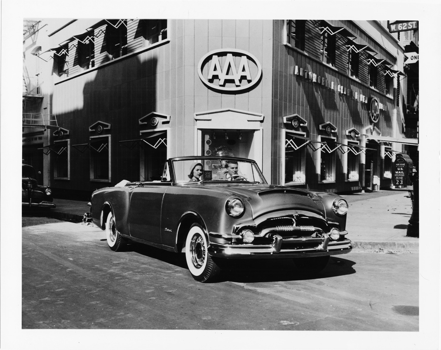1953 Packard Caribbean convertible, top folded, parked on street in front of AAA building