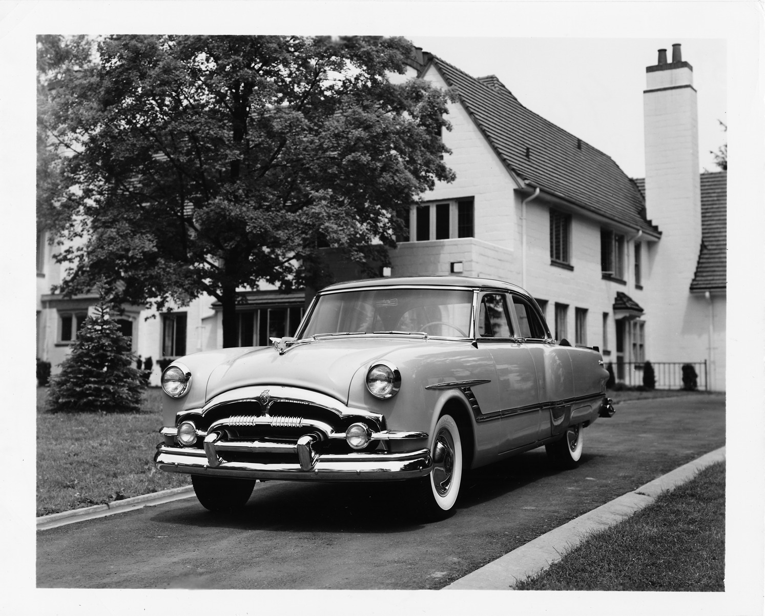 1953 Packard touring sedan, parked in driveway in front of house