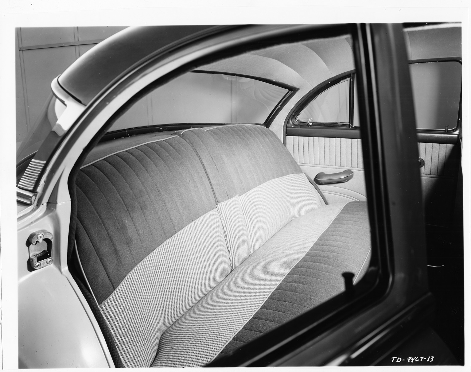 Packard Co. file photograph of a 1954 Packard Super Clipper, view of rear seat through window of right rear passenger door.
