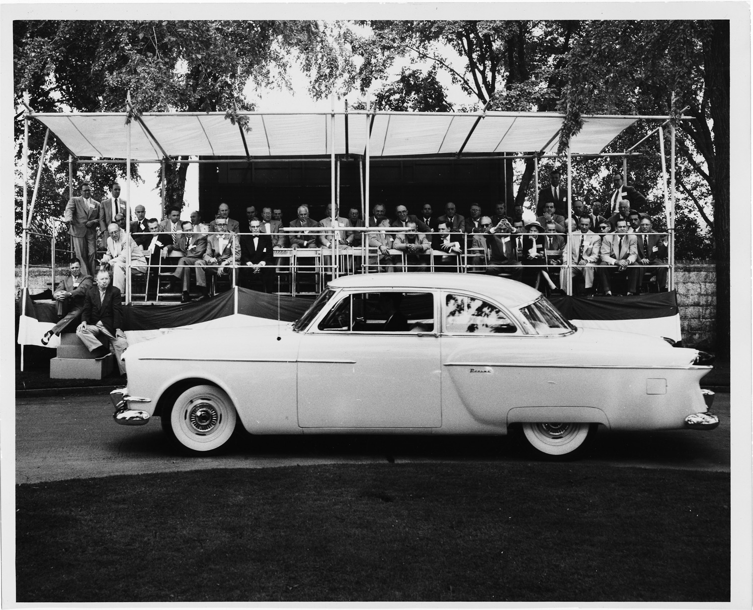 Packard Co. file photograph of a 1954 Packard left side view, parked in front of reviewing stand. Inscribed on photo back: "1954 Packard Clipper deluxe, fifty-fourth series, model 5401, 8-cylinder, 122-inch wheelbase, 6-person sportster (body type #5497), special show car: had painted grille surround, "Panama" script on rear fender, reviewing stand, outdoor display, Packard Proving Grounds entrance."