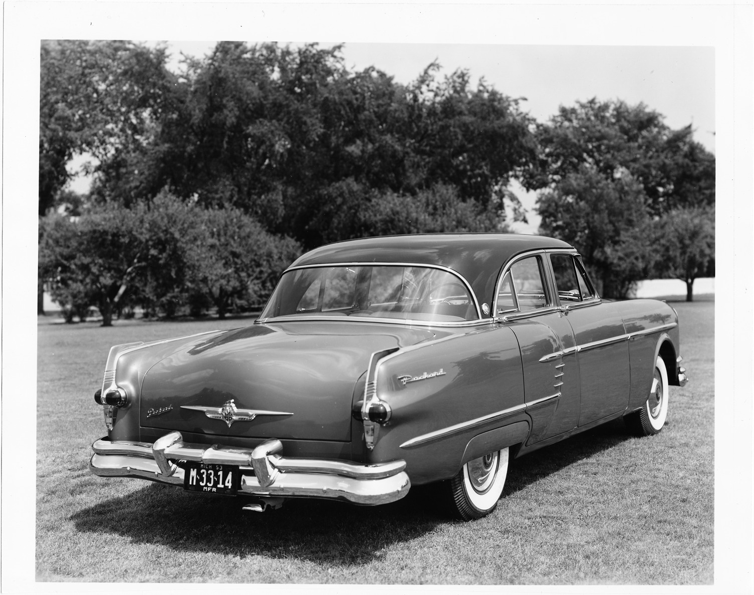 Favorite this☆ 1954 Packard Panther Patrician, three-quarter rear right view, parked on grass Description: Packard Co. file photograph of a 1954 Packard Panther Patrician 2-door sedan, three-quarter rear right view, dual white sidewall tires, parked on grass, 1953 Michigan manufacturer plate #M-33-14. Details Resource ID: EB01e553 Creator: Packard Motor Car Company Subject: Packard automobile Photographic prints Date Issued: 1954 Format: 1 photographic print ; 8 x 10 in. Member of: National Automotive History Collection Packard Collection Rights: Physical rights are retained by DPL. Copyright is retained in accordance with U.S. copyright laws.