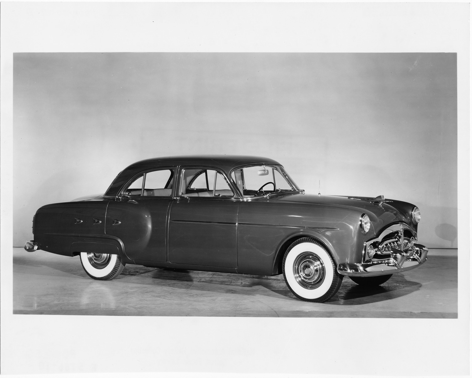 Favorite this☆ 1952 Packard 4-door sedan, seven-eights right side view Description: Packard Co. file photograph of a 1952 Packard 200 4-door sedan, seven-eights right side view, dual white sidewall tires, special jet wing emblem. Details Resource ID: EB01e567 Creator: Packard Motor Car Company Subject: Packard automobile Photographic prints Date Issued: 1952 Format: 1 photographic print ; 8 x 10 in. Member of: National Automotive History Collection Packard Collection Rights: Physical rights are retained by DPL. Copyright is retained in accordance with U.S. copyright laws.