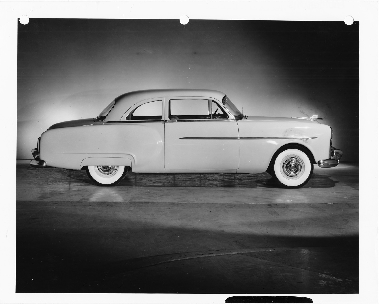 Packard Co. file photograph of a 1952 Packard right side view, dual white sidewall tires, special jet wing emblem. Inscribed on photo back: "1952 Packard 200 standard, twenty-fifth series, model 2595, 8-cylinder, 135-horsepower, 122-inch wheelbase, 6-person club sedan (body type #2595), note new for 200 bumper guards."