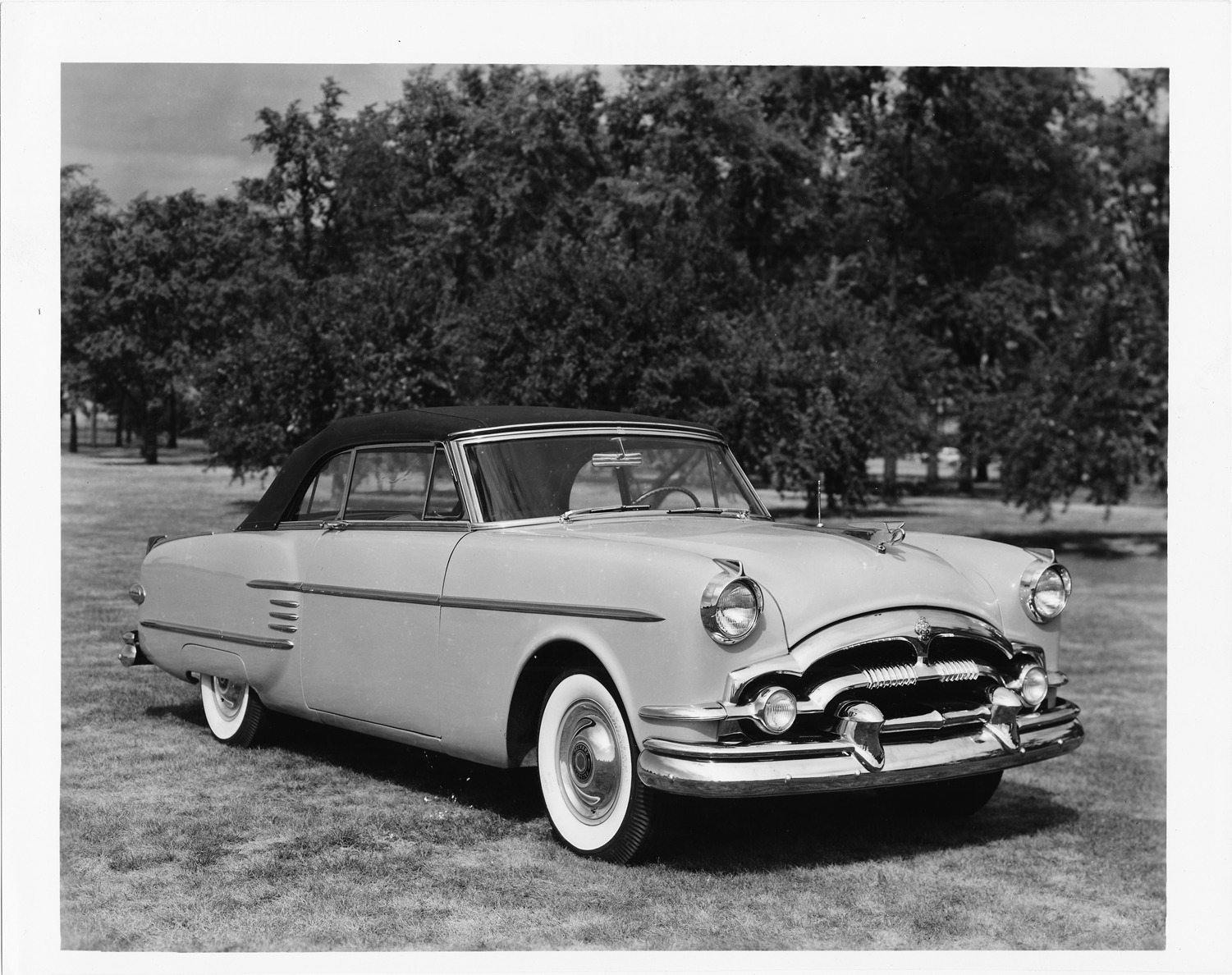 Packard Co. file photograph of a 1954 Packard 2-door convertible, three-quarter right side view, top raised, dual white sidewall tires, pelican emblem, parked on grass.