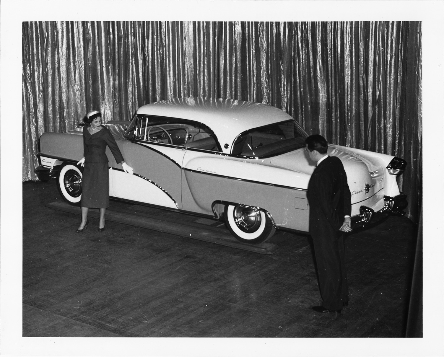 Packard Co. file photograph of a 1955 Packard Clipper Constellation, seven-eights left rear view, dual white sidewall tires, 2-door, on display, female standing at driver's door, man standing at rear.
