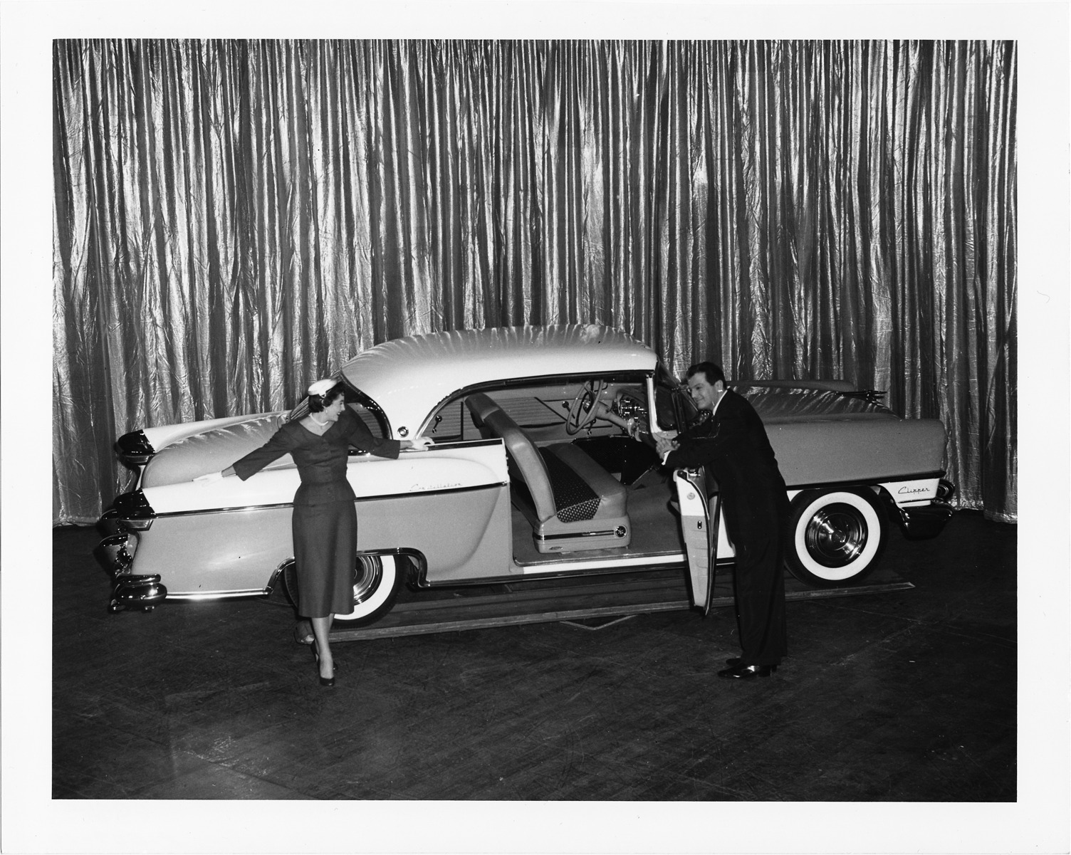 Packard Co. file photograph of a 1955 Packard Clipper Constellation, right side view, passenger door open, dual white sidewall tires, 2-door, on display, female standing near rear tire, man holding open door.