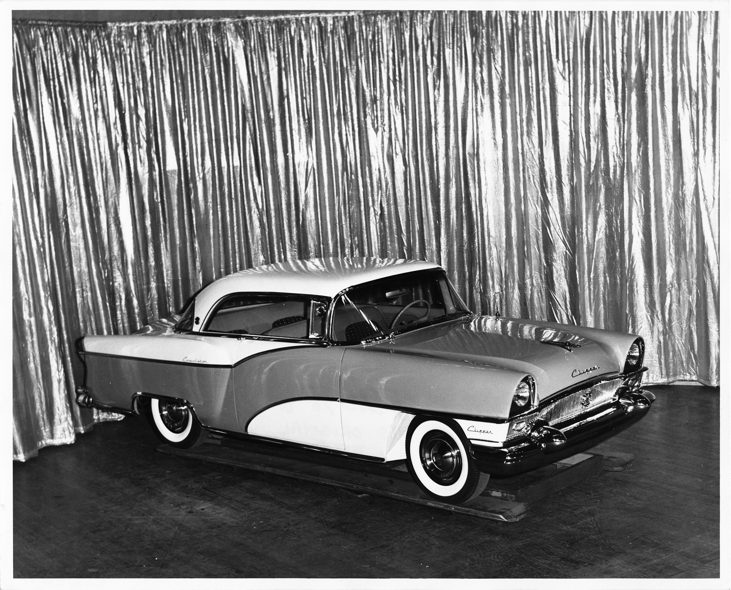 Packard Co. file photograph of a 1955 Packard seven-eights right side view, on display. Inscribed on photo back: "1955 Packard Clipper custom, fifty-fifth series, model 5560, 8-cylinder, 245-horsepower, 122-inch wheelbase, 6-person Constellation hardtop (body type #5567)."