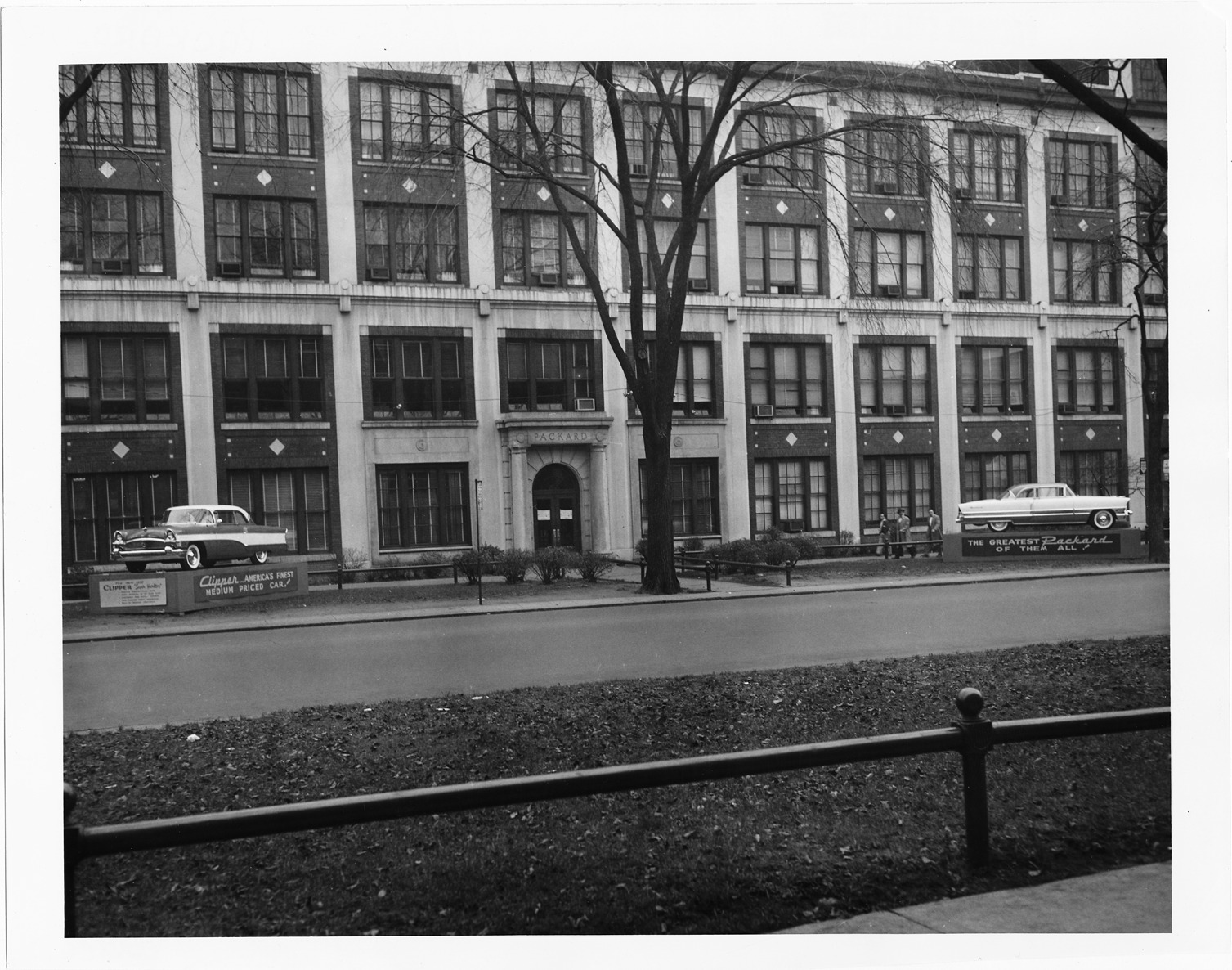 Packard Co. file photograph of the Packard Executive office building, with two 1956 Packards on display, right sign reads "The greatest Packard of them all," left sign reads "Clipper America's finest medium priced car." Inscribed on photo back: "Packard Motor Car Co. executive/administrative office bldg. East Grand Blvd., Detroit, Mich., left; 1956 Packard Clipper super, fifty-sixth series, model 5640, 8-cylinder, 240-horsepower, 122-inch wheelbase, "Panama" 2-door hardtop, 6-person (body type #5647), right; 1956 Packard 400, fifty-sixth series, model 5680, 8-cylinder, 290-horsepower, 127-inch wheelbase, 2-door hardtop, 6-person (body type #5687)."