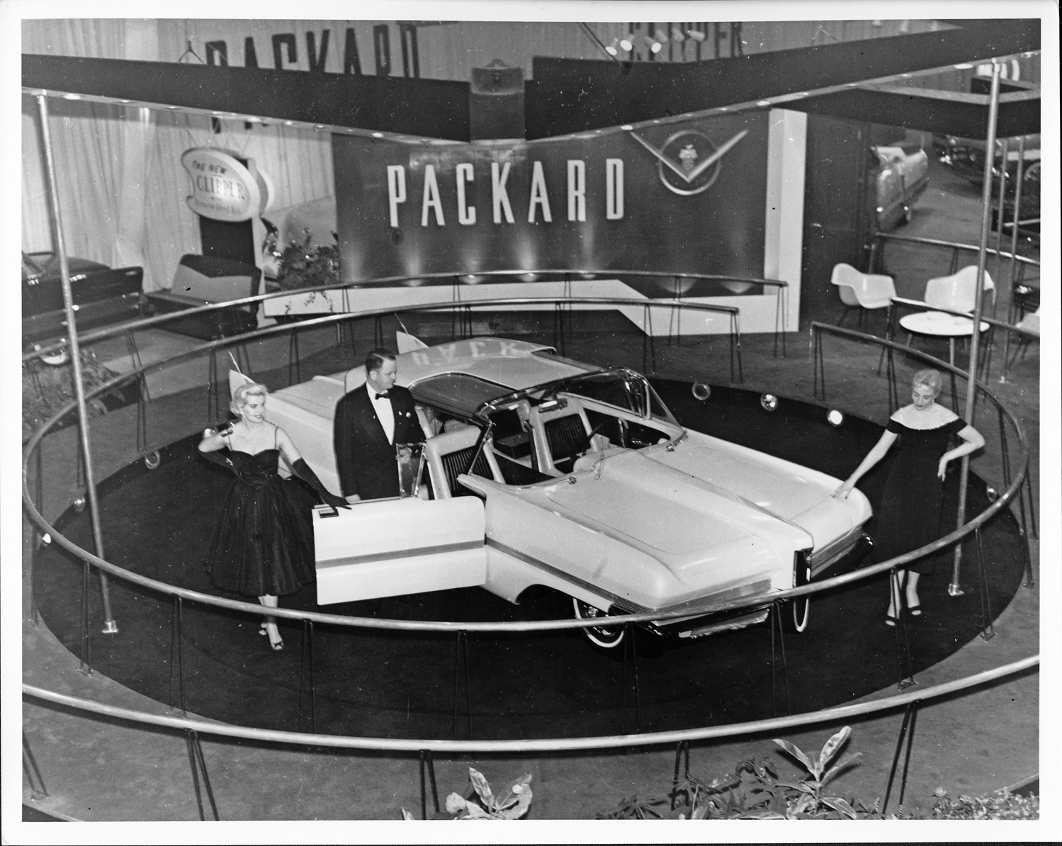 Packard Co. file photograph of a 1956 Packard show car, three-quarter right side view, white sidewall tires, aluminum sliding doors closed, female and male standing at passenger door, female standing at front of car, on display, sign in back reads "Packard." Inscribed on photo back: "1956 Packard Predictor, dream car, body by Ghia."