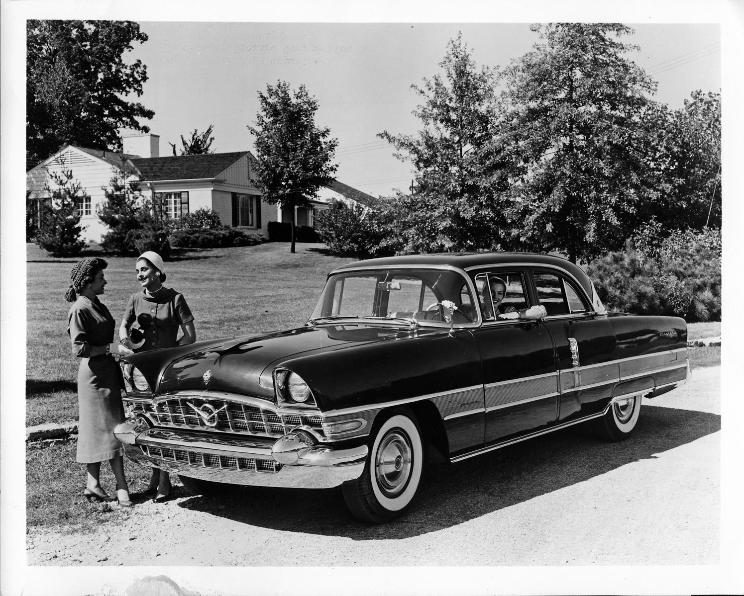 Packard Co. file photograph of a 1956 Packard 2-door sedan, three-quarter left side view, white sidewall tires, redesigned emblem, woman behind wheel, two women standing at front passenger side, parked on street, house in background. Photo caption on back from unidentified Packard source: "The newest Packard luxury sedan goes on display in dealerships throughout the country Thursday, November 3, Packard models for 1956 feature an improved torsion bar suspension system, a new electric push-button automatic transmission and new, larger displacement V-8 engines, the Packard Patrician is powered by a 290-horsepower V-8 with a 10 to 1 compression ratio, and the highest toque ever engineered into an American automobile engine for top performance in normal speed ranges, Packard V-8 engines are compact and durable and may be expected to deliver as many as 100,000 miles of trouble free driving under normal operation with normal maintenance attention."