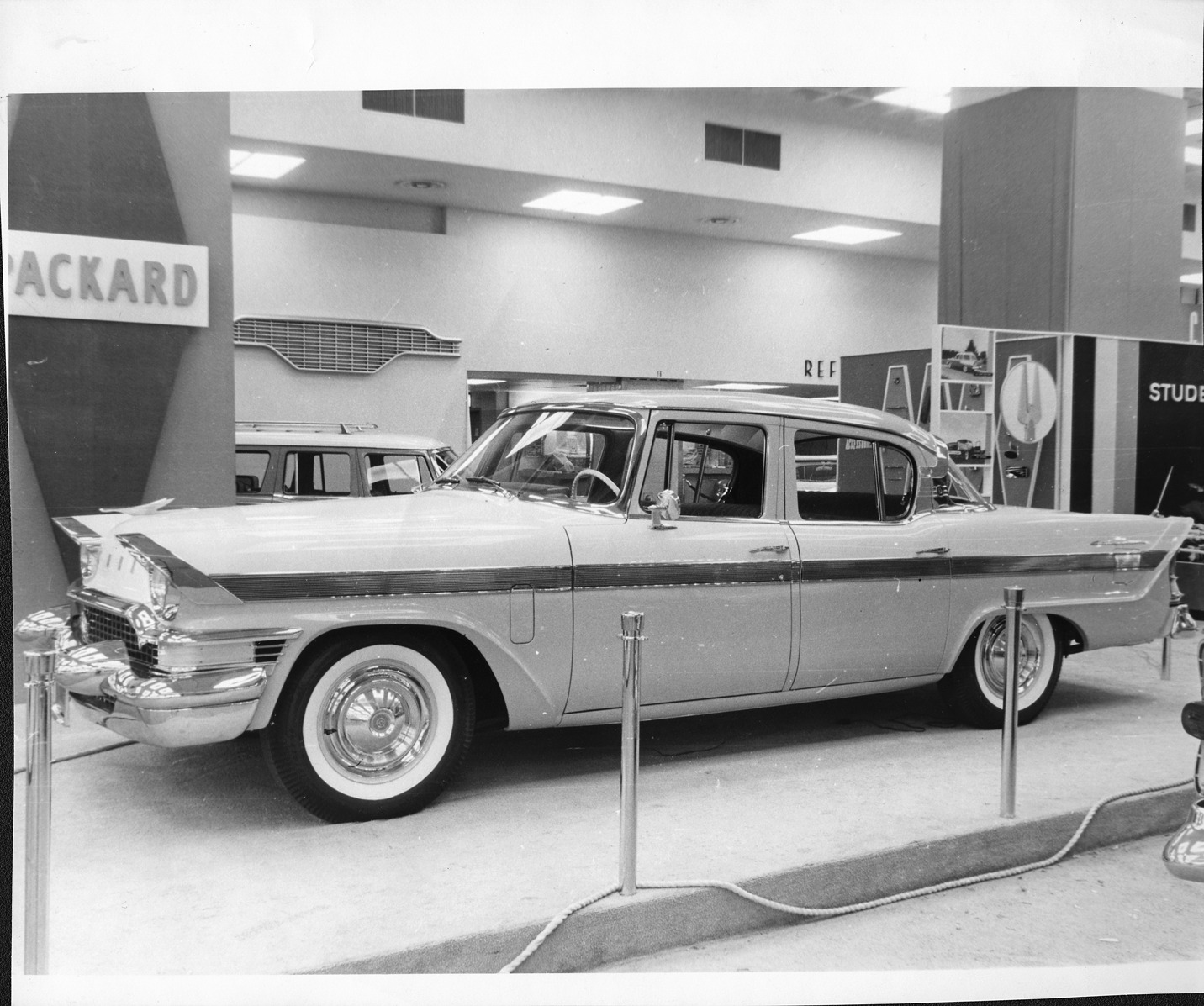 Favorite this☆ 1957 Packard 4-door sedan, nine-tenths left side view Description: Packard Co. file photograph of a 1957 Packard 4-door sedan, nine-tenths left side view, redesigned emblem, dual white sidewall tires, on display. Details Resource ID: EB01e641 Creator: Packard Motor Car Company Subject: Packard automobile Photographic prints Date Issued: 1957 Format: 1 photographic print ; 8 x 9.5 in. Member of: National Automotive History Collection Packard Collection Rights: Physical rights are retained by DPL. Copyright is retained in accordance with U.S. copyright laws.