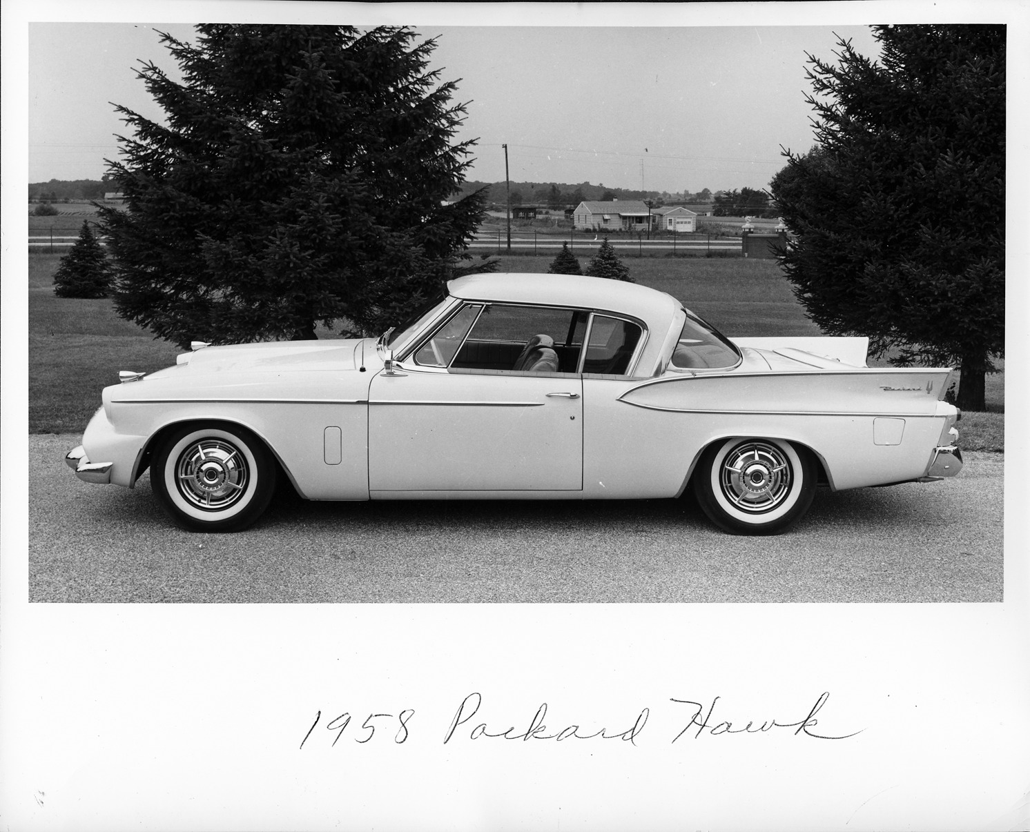 Favorite this☆ 1958 Packard Hawk, left side view, parked on drive Description: Packard Co. file photograph of a 1958 Packard left side view, dual white sidewall tires, 2-door, parked on drive, houses in background. Details Resource ID: EB01e668 Creator: Packard Motor Car Company Subject: Packard automobile Photographic prints Date Issued: 1958 Format: 1 photographic print ; 8 x 10 in. Member of: National Automotive History Collection Packard Collection Rights: Physical rights are retained by DPL. Copyright is retained in accordance with U.S. copyright laws.