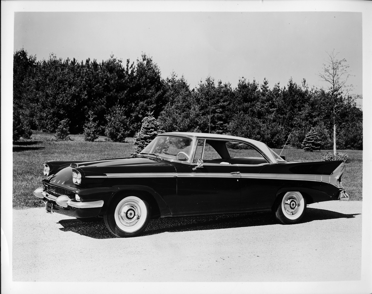 Packard Co. file photograph of a 1958 Packard sedan, nine-tenths left side view, parked on drive. Photo caption on back from Packard Public Relations Dept.: "This sleek, all new 1958 Packard 2-door hardtop is a new addition to the expanded line of Packards for 1958, bringing the line to four models, the Packard Hawk, the 4-door sedan, and the 4-door station wagon, dual headlights are contained in a jet type nacelle and the lowered, flowing roof line is reminiscent of the symmetry of an airfoil."