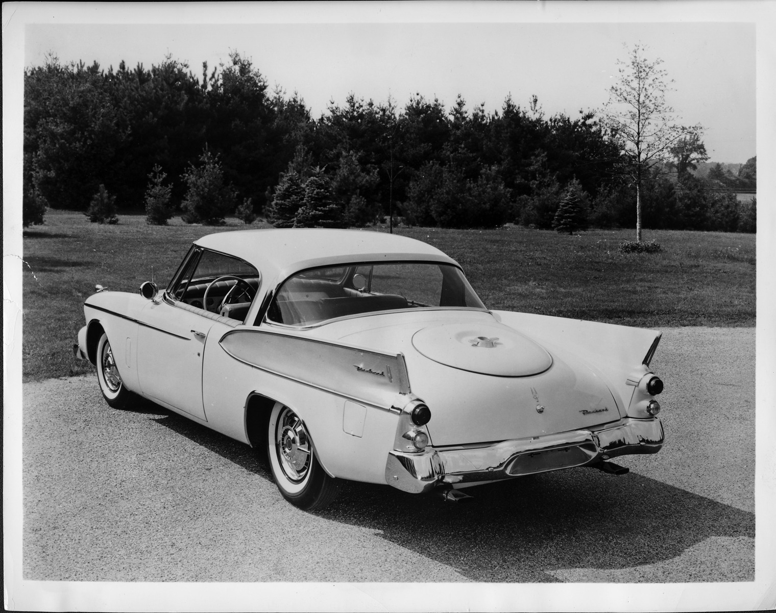 Packard Co. file photograph of a 1958 Packard three-quarter rear view. Photo caption on back from Packard Public Relations Dept.: "1958 Packard Hawk, fifty-eighth series, model 58-L, 8-cylinder, 275-horsepower (289-cubic inch), 120-inch wheelbase, (2-door) 6-person hardtop (body type K-9), V-8 supercharged 289-cubic inch engine generating 275-horsepower with luxury leather interior."