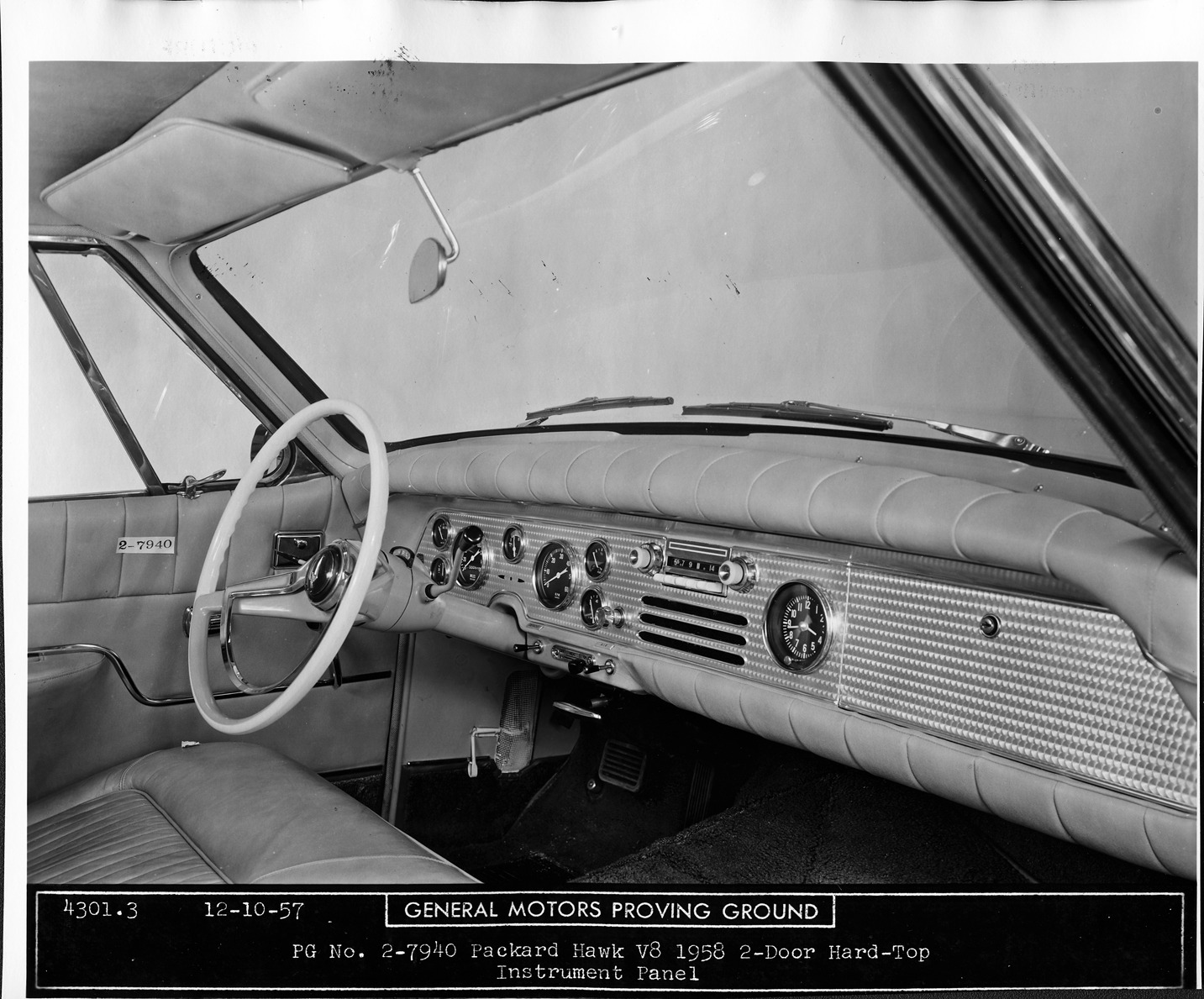 Packard Co. file photograph of a 1958 Packard Hawk, view of dashboard and steering wheel, from passenger side door. Inscribed on photo front: "General Motors Proving Grounds, Packard Hawk V-8 1958 2-door hardtop, instrument panel."