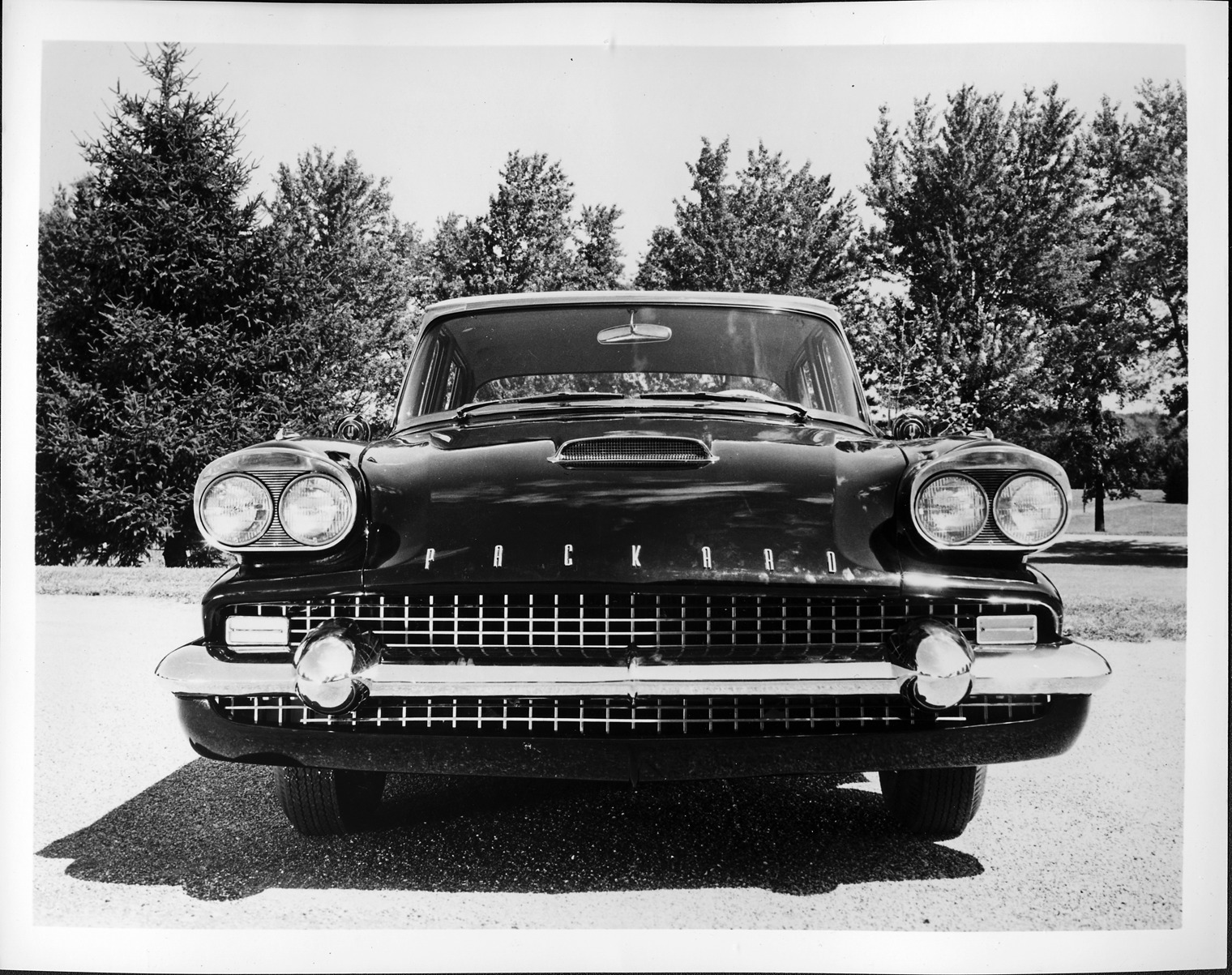 Packard Co. file photograph of a 1958 Packard front view. Photo caption on back from Packard Public Relations Dept.: "A look of motion is imparted to the new 1958 Packard 4-door sedan by the sleek lines of the forward sloping hood with its crowning airscoop, dual headlamps are standard on the sedan, 2-door hardtop, and 4-door station wagon, these are housed in distinctive jet type nacelles surmounted with slim fender ornaments, directional lights are mounted above the massive wrap around bumper in the slender, graceful grille section, flightomatic transmission and power brakes are standard equipment on all Packards."