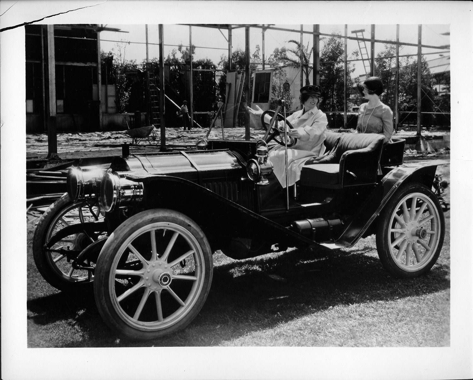 Packard Co. file photograph of a 1908 Packard seven-eights left side view, two women in car, construction site in background. Inscribed on photo back: "1908 Packard model 30, on Hollywood set under construction, with actresses Polly Moran and Anita Page."