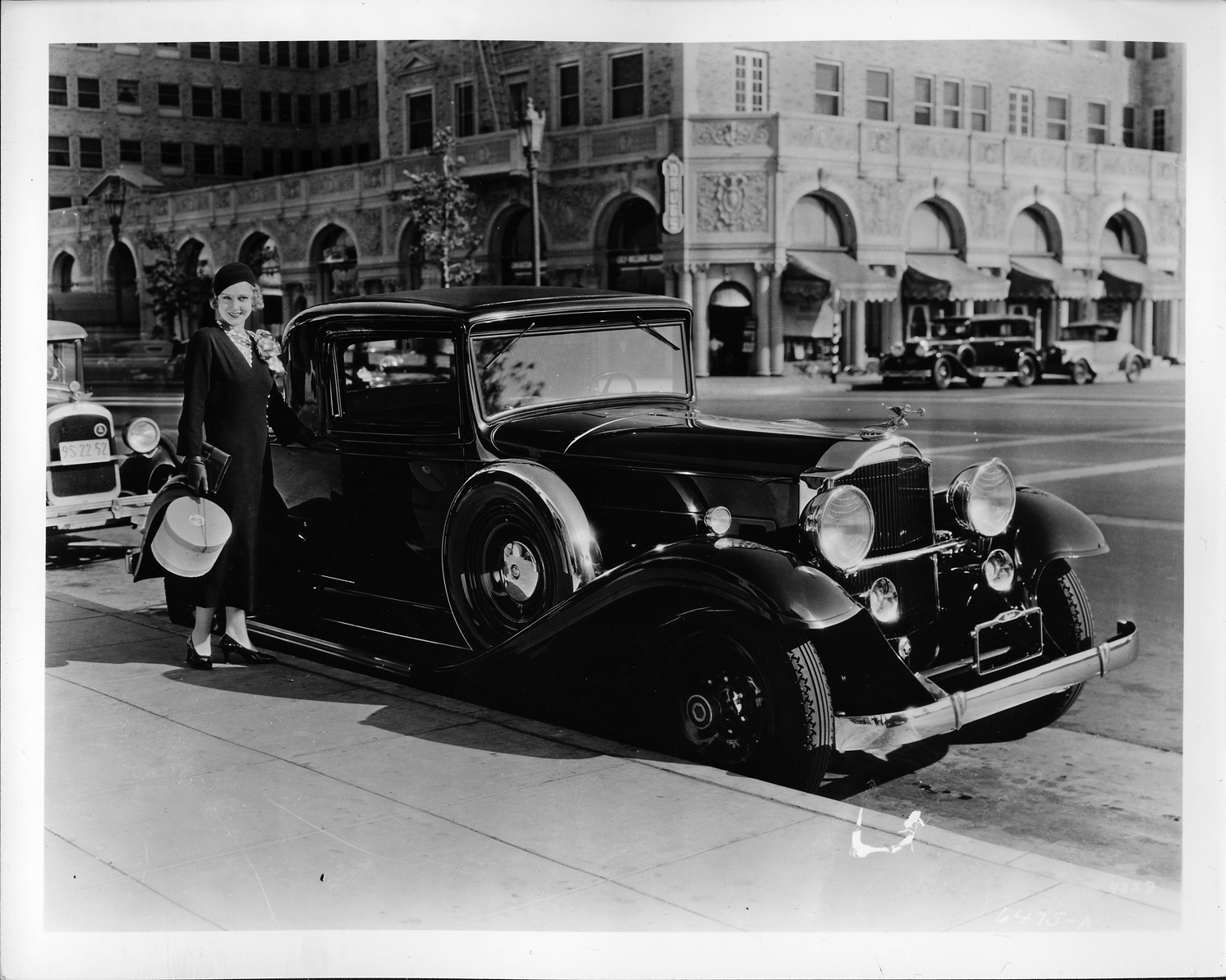 Packard Co. file photograph of a 1932 Packard three-quarter right front view, parked in street, owner Madge Evans standing at passenger door. Inscribed on photo back: "1932 Packard eight, model 902, ninth series eight, 8-cylinder, 110-horsepower, 136.5-inch wheelbase, 2/4-person coupe (body type #508), note: deluxe equipment, chromium plated tread covers for spare tires, film actress Madge Evans."