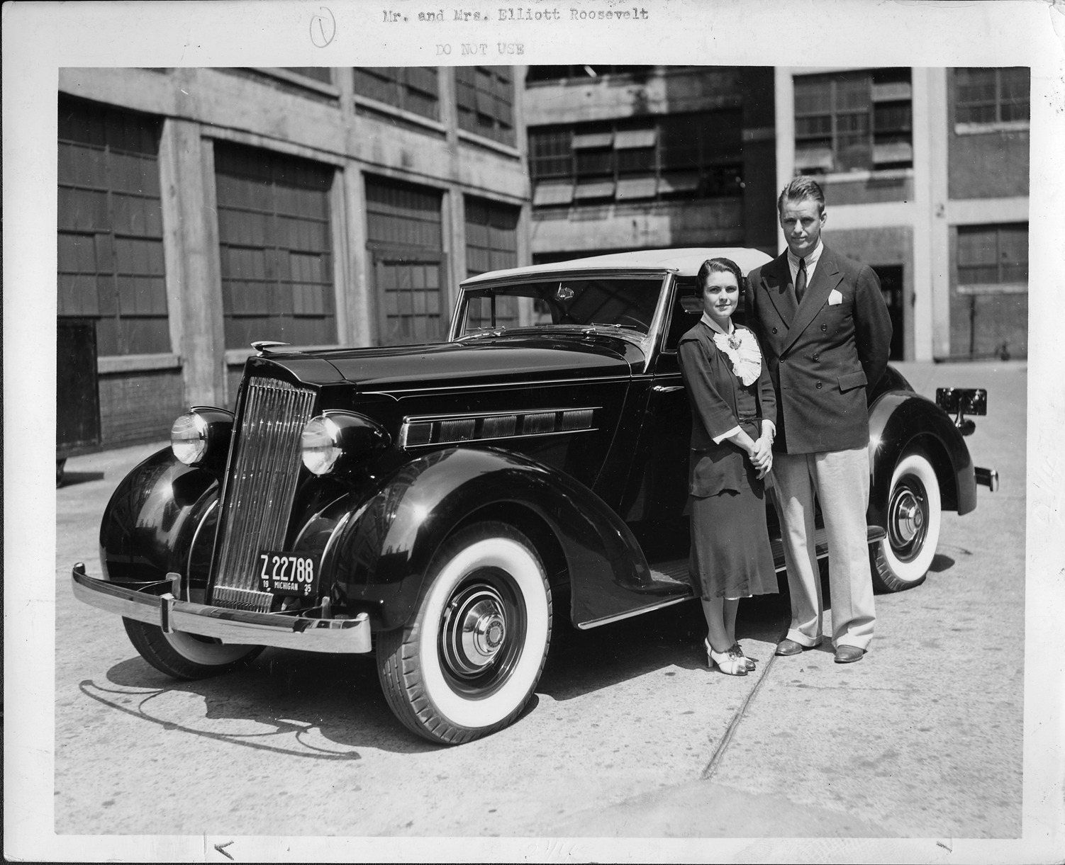 Packard Co. file photograph of a 1935 Packard three-quarter left side view, Mr. & Mrs. Elliott Roosevelt standing at driver's door. Inscribed on photo back: "1935 Packard one twenty, model 120, twelfth series eight, 8-cylinder, 110-horsepower, 120-inch wheelbase, 2/4-person convertible coupe (body type #899), note: 1935 Michigan license plate #Z-22788; setting: Packard Motor Car Co., East Grand Blvd., Detroit, Mich."