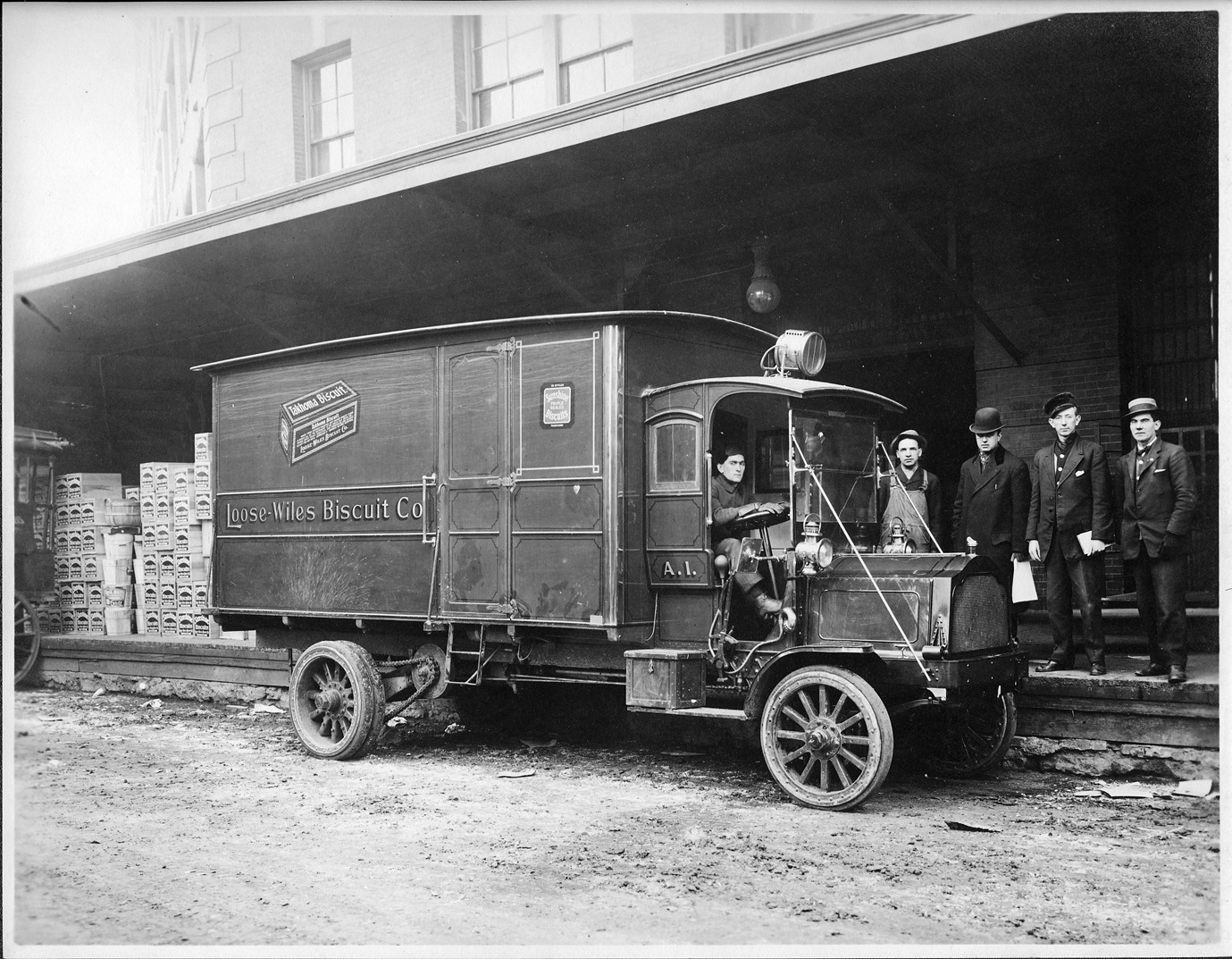 Packard Co. file photograph of an early 1900s Packard truck, right side view, has enclosed rear compartment and partially enclosed front, spot light mounted on top of front cab, side of truck reads "Loose-Wiles Biscuit Co., Takhoma Biscuit, Sunshine Triple Sealed Biscuit," parked at loading dock, man behind wheel, four men standing next to truck.