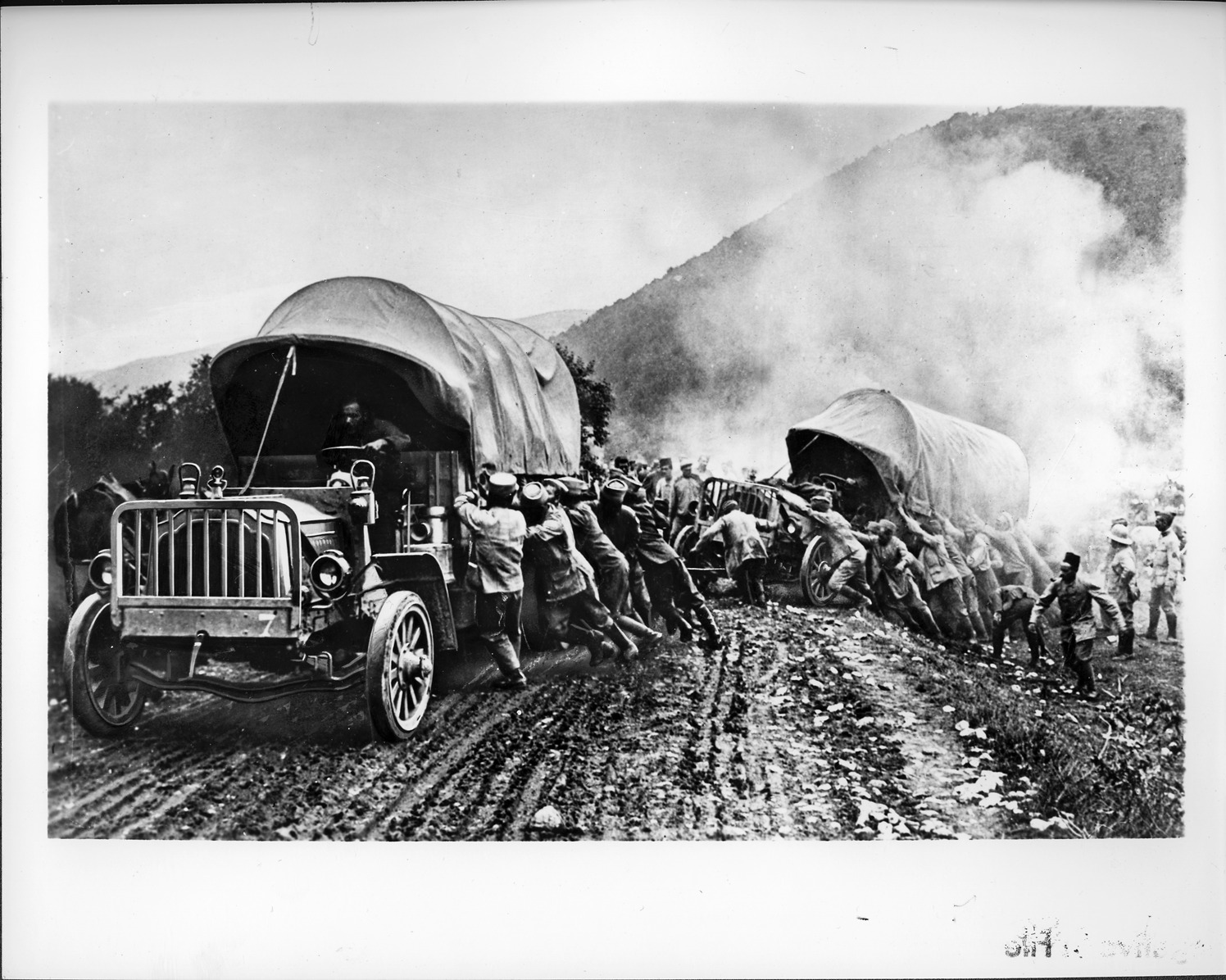 Packard Co. file photograph of two 1915 Packard front view, top raised, canvas tops, one on a rocky dirt road, rear truck driving up side bank, several troops pushing alongside of the two trucks. Inscribed on photo back: "1915 Packard motor trucks with French Army on the World War I front."