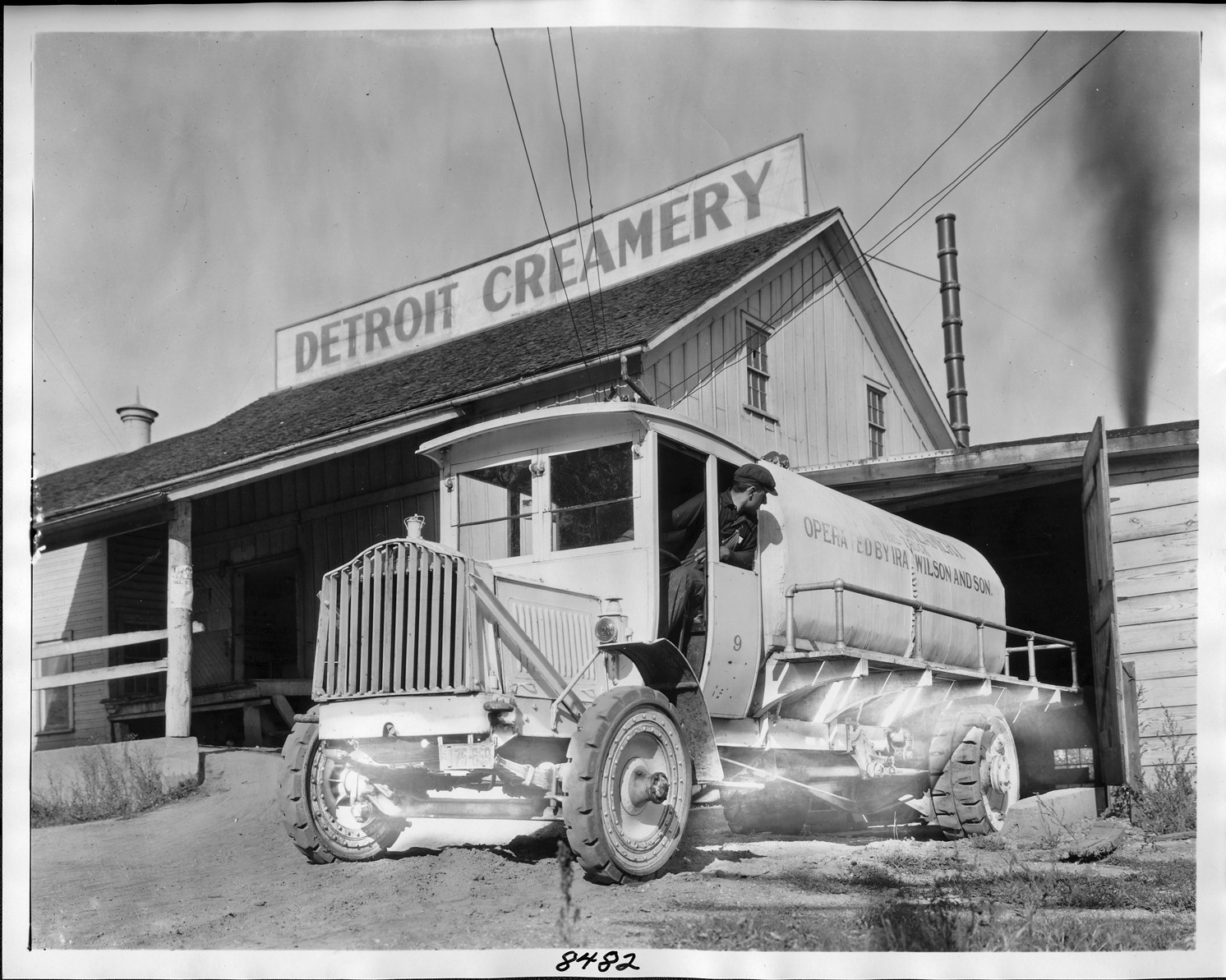 Packard Co. file photograph of a 1916-17 Packard three-quarter front view, enclosed front cab, tank mounted on rear of chassis, tires have special treads, side of tank reads "Detroit Creamery this truck operated by Ira Wilson and Son," man behind wheel backing into loading area, sign on top of building reads "Detroit Creamery."