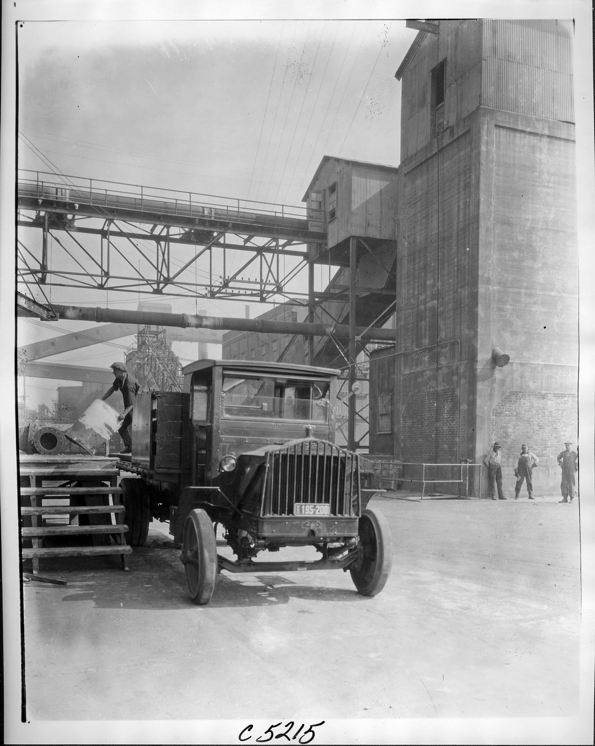 Packard Co. file photograph of a 1919 Packard front view, license plate mounted at front #195-200, partially enclosed front cab, enclosed rear, man on truck bed unloading large cylinder, factory in background, three men standing in right side background.