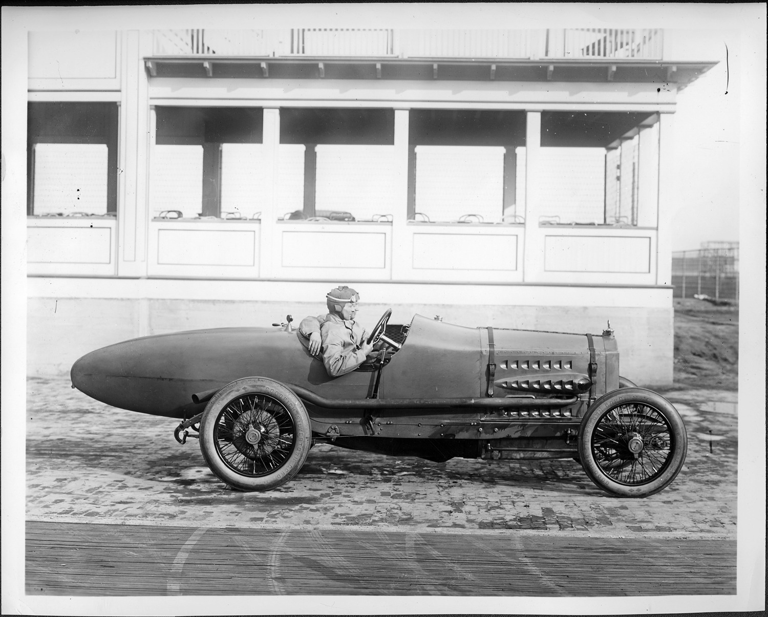 Packard Co. file photograph of a Packard left side view, wire wheels, large exhaust pipe running length of car, parked on track, building in background, two men inside car wearing caps with goggles. Inscribed on photo back: "'299' Packard "500" race car, #1 airplane 60 degree-V prototype engine."