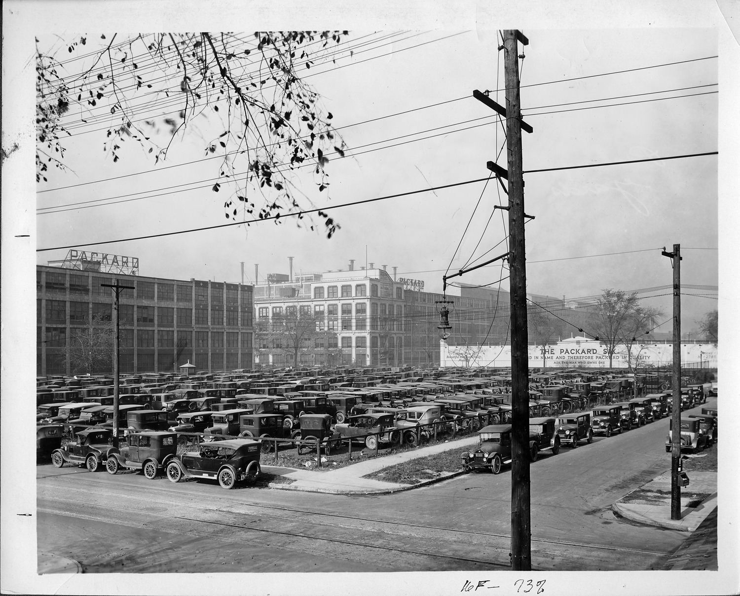 Packard Co. file photograph of the Packard factory parking yard, early 1900s, several different models of Packards lining the street behind and next to yard, two factories with "Packard" sign in background, building in right background reads "Many new beautiful and luxurious models, The Packard SK, in name and therefore Packard in quality, ask the man who owns one." Typed on back: "Factory buildings, parking yards."