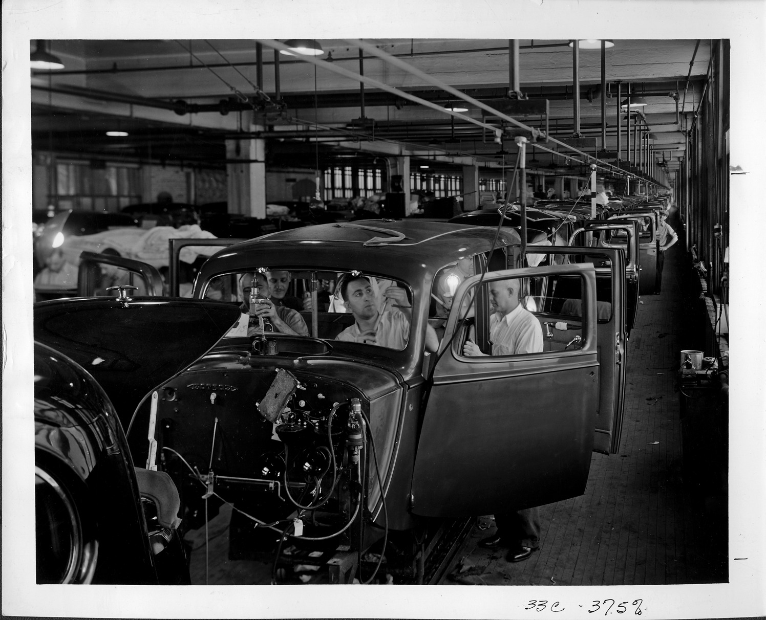 Favorite this☆ Packard factory assembly line, workers inside bodies installing interior parts Description: Packard Co. file photograph of a Packard factory assembly line, workers inside body installing interior parts, both doors open, no engines or windows. Details Resource ID: EB01e792 Creator: Packard Motor Car Company Subject: Packard automobile Assembly-line methods Automobile industry workers Photographic prints Date Issued: Unknown year Format: 1 photographic print ; 8 x 10 in. Member of: National Automotive History Collection Packard Collection Rights: Physical rights are retained by DPL. Copyright is retained in accordance with U.S. copyright laws.
