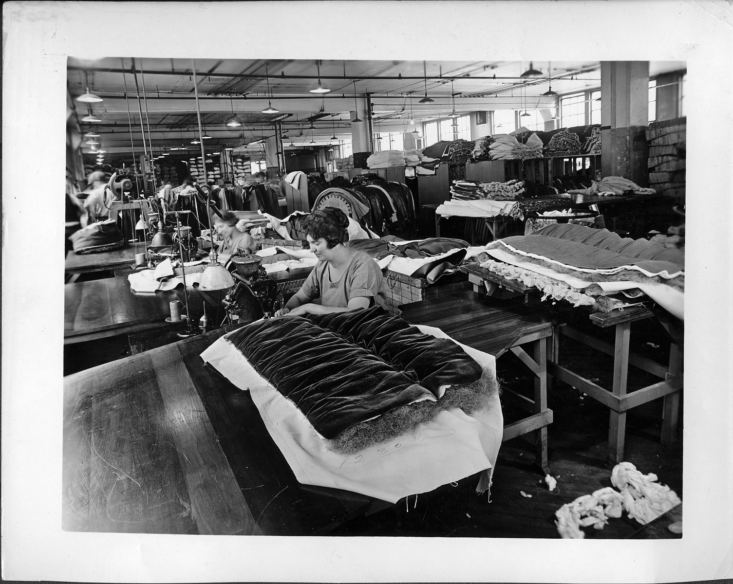Packard Co. file photograph of the 1925 Packard upholstery department, two women at sewing machines in foreground working on cushions, stacks of cloth in background.