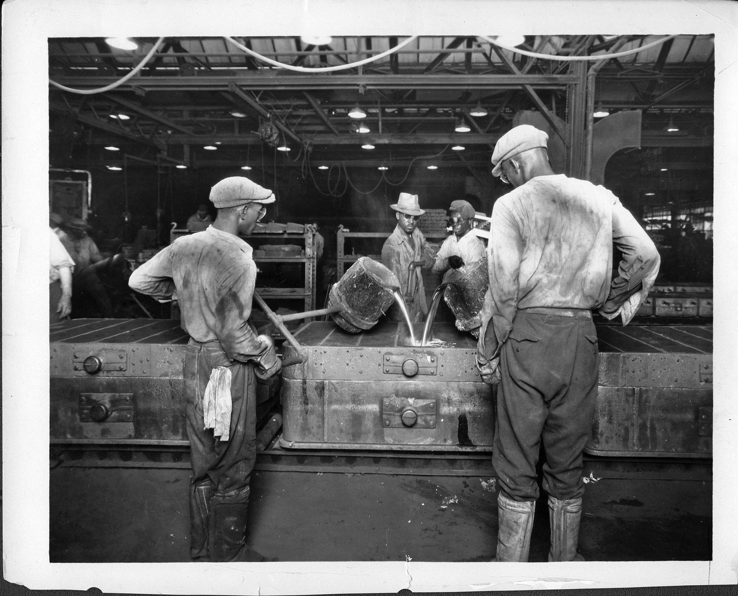 Favorite this☆ Workers pouring molten metal in Packard factory, 1928 Description: Packard Co. file photograph of a 1928 Packard factory scene, four workers pouring molten metal into a steel mold, two men standing on either side of mold. Details Resource ID: EB01e803 Creator: Packard Motor Car Company Subject: Packard automobile Automobile factories--Michigan--Detroit African American automobile industry workers--Michigan--Detroit Photographic prints Date Issued: 1928 Format: 1 photographic print ; 8 x 10 in. Member of: National Automotive History Collection Packard Collection Rights: Physical rights are retained by DPL. Copyright is retained in accordance with U.S. copyright laws.