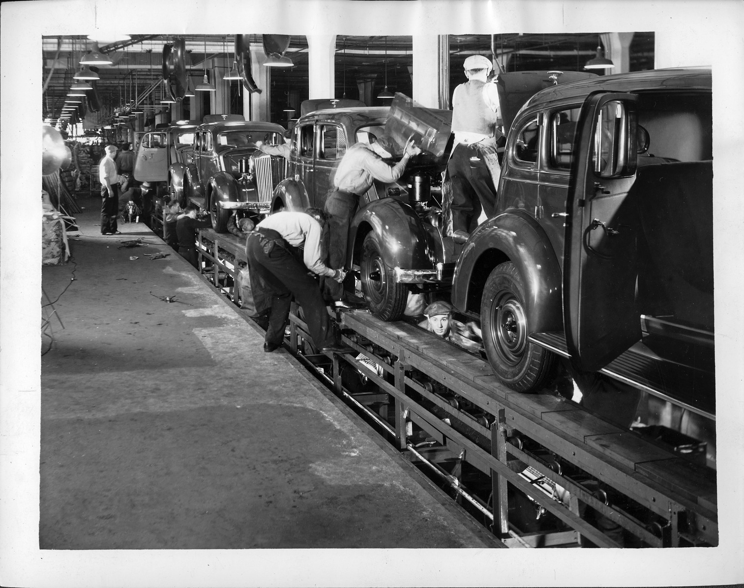 Packard Co. file photograph of 1935 Packard final assembly line, several sedans with workers on line. Inscribed on photo back: "Packard Motor Car Co., final assembly, completing examples of the 1935 Packard one-twenty, twelfth series, model 120, 8-cylinder, 110-horsepower, 120-inch wheelbase, 5-person sedan (body type #893)."