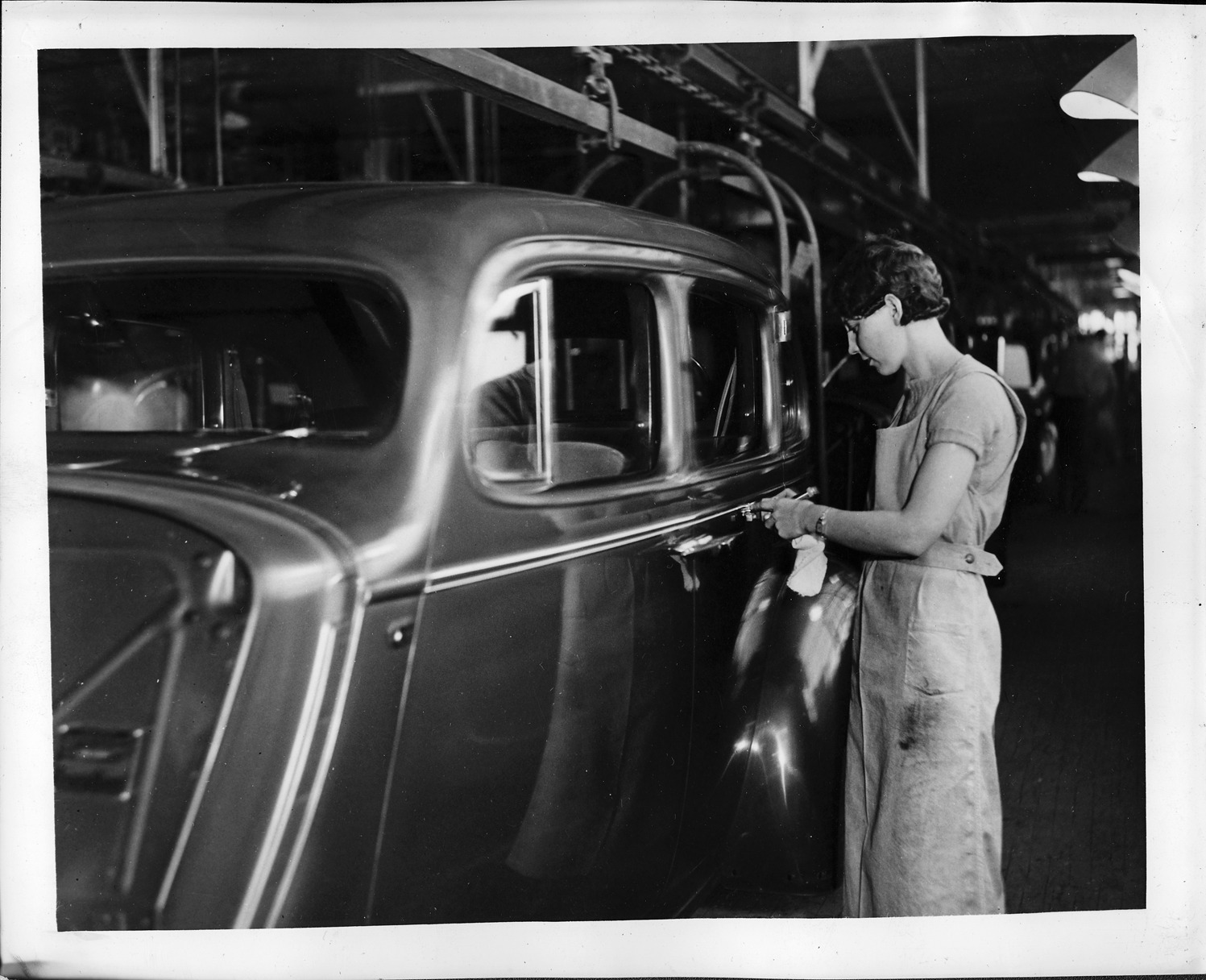Woman worker applying body striping on Packard assembly line, 1936